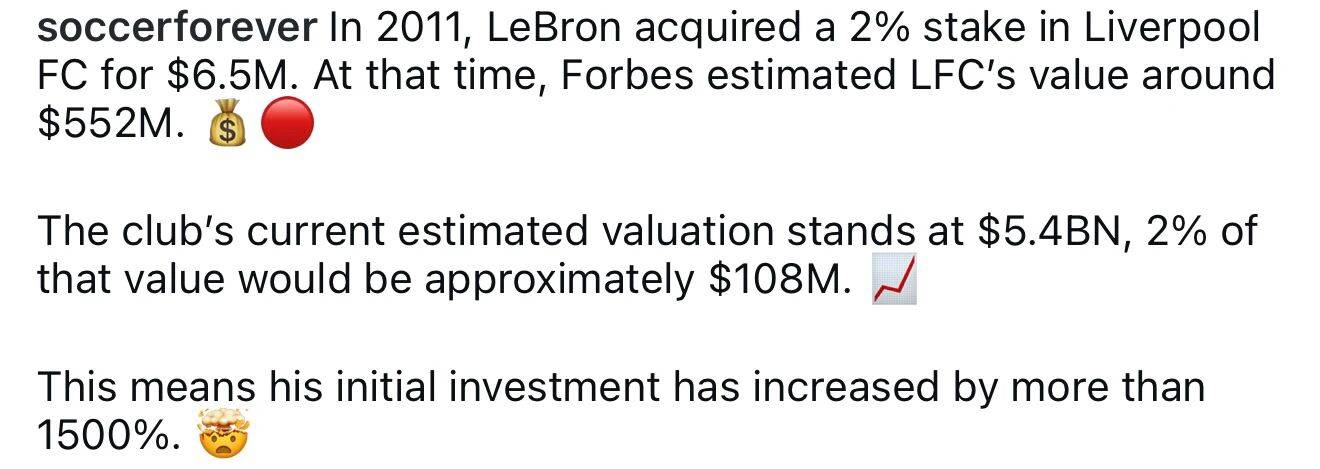 ปัจจุบันมีมูลค่าประมาณ 5.4 พันล้านดอลลาร์สหรัฐ การถือหุ้น 2% ในสโมสรมีมูลค่าประมาณ 108 ล้านดอลลาร์สหรัฐ ซึ่งคิดเป็นผลตอบแทนจากการลงทุนเริ่มต้นของเจมส์ถึง 15 เท่า ช่างมีสายตาที่เฉียบแหลมในการลงทุนจริงๆ!