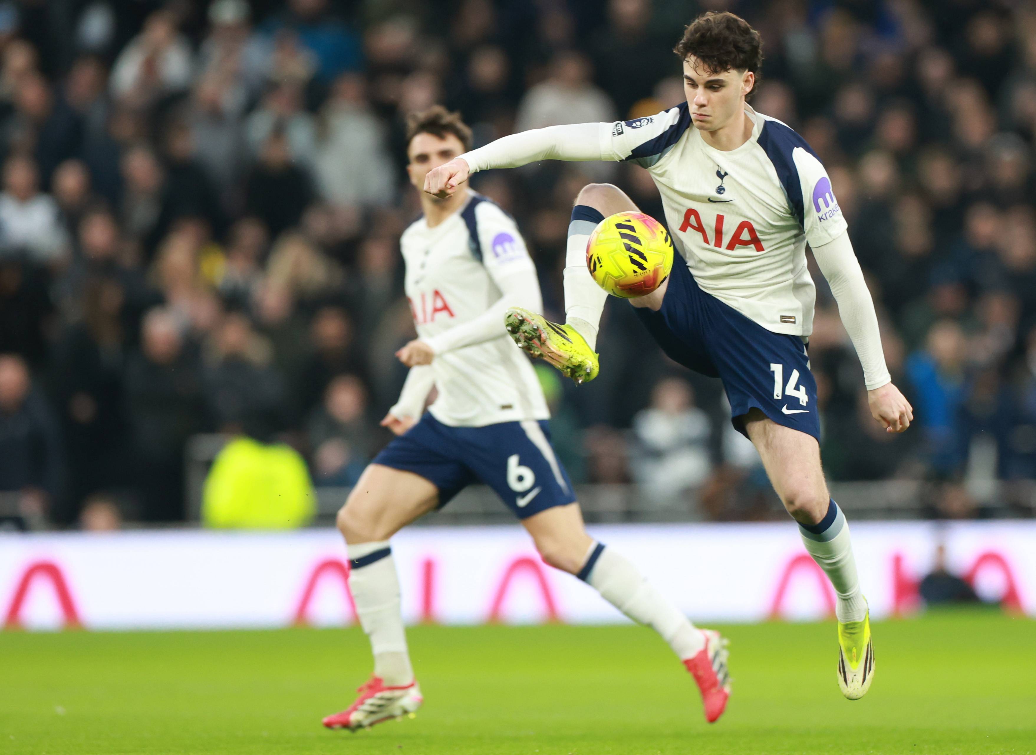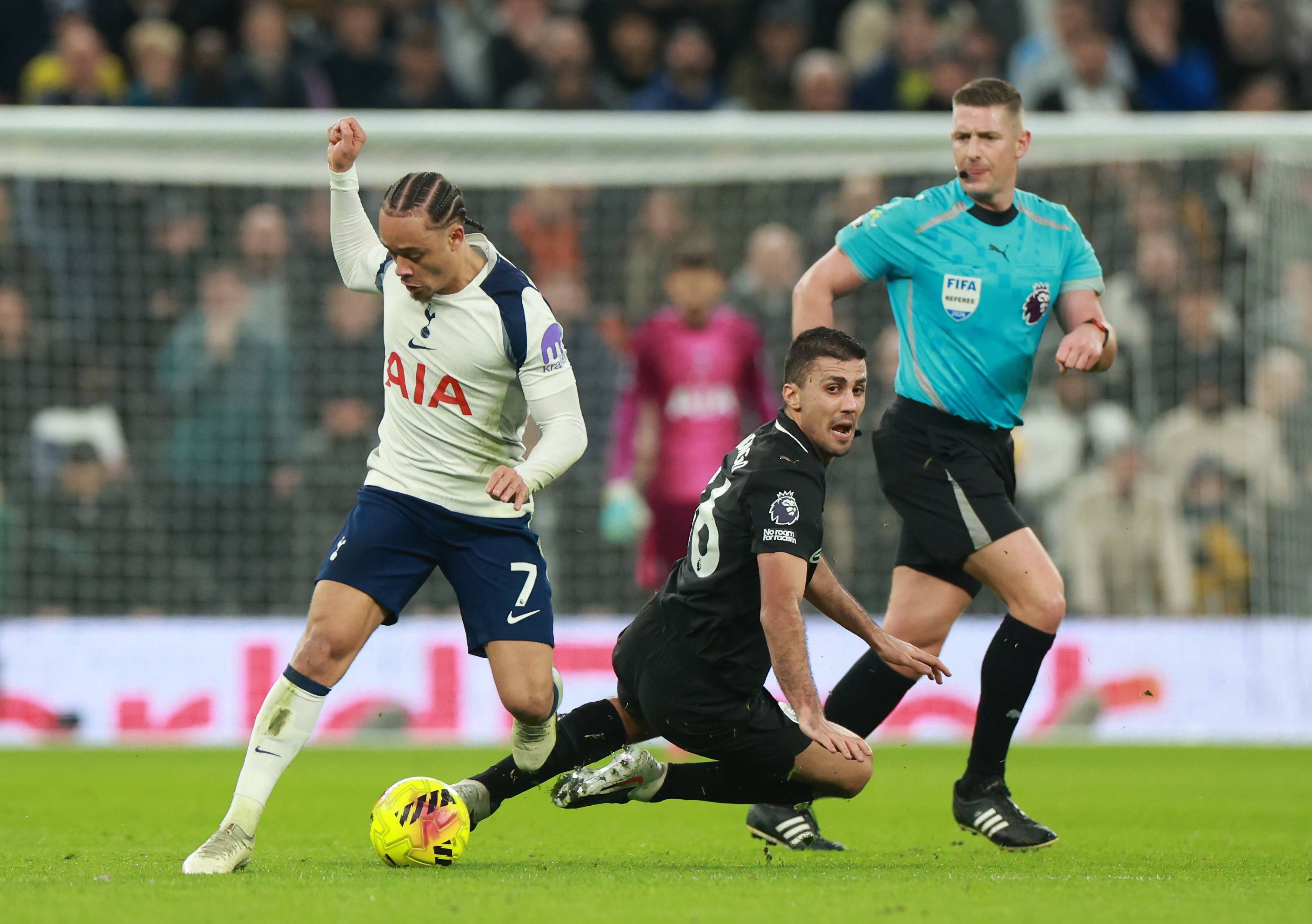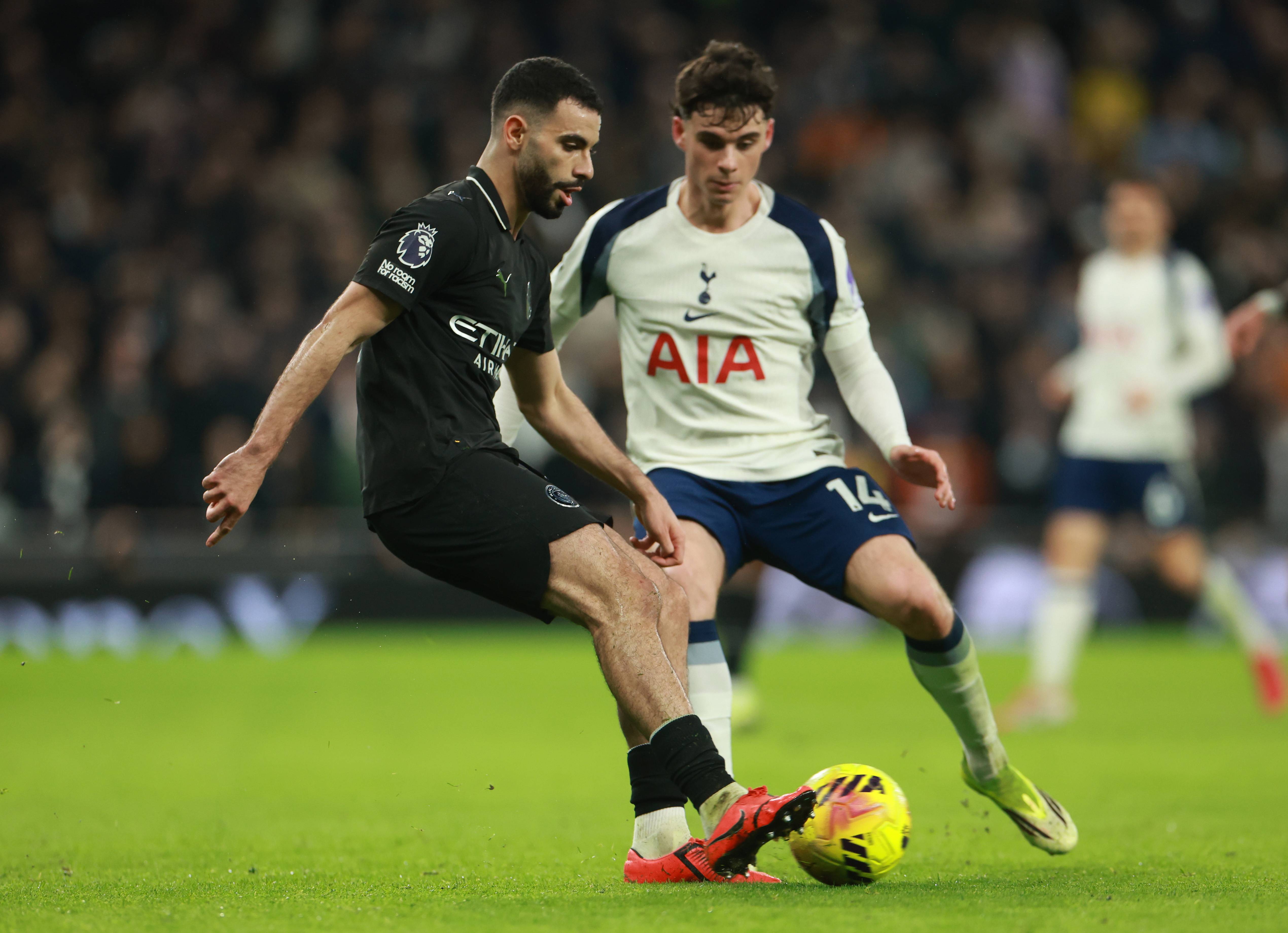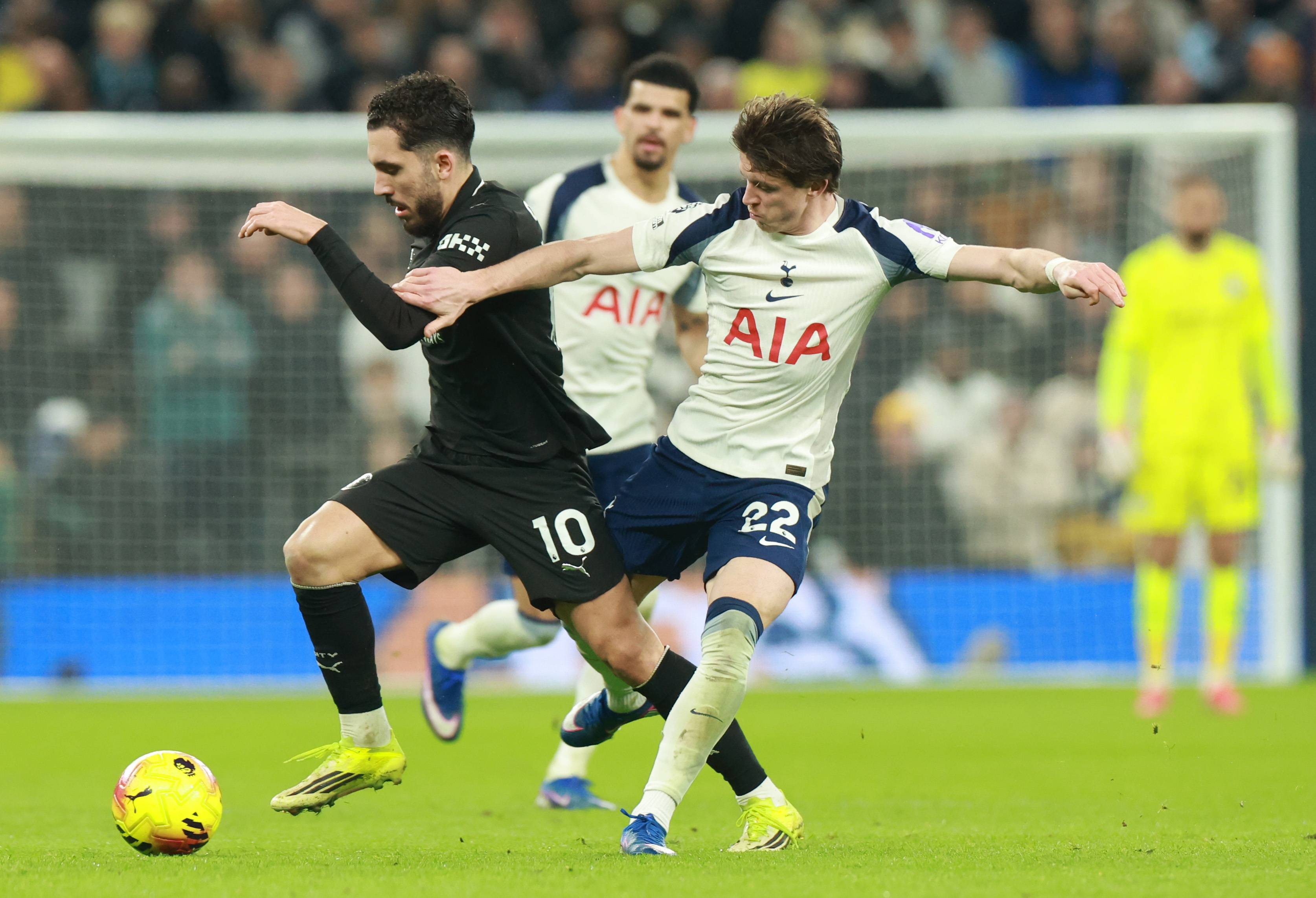 เมื่อวันที่ 1 กุมภาพันธ์ แฮร์รี่ วิงค์ส ของท็อตแนม ฮ็อตสเปอร์ (ซ้าย) เข้าปะทะกับ โรดรี้ ของแมนเชสเตอร์ ซิตี้ เพื่อแย่งบอล. ซีนา/อีพีเอ