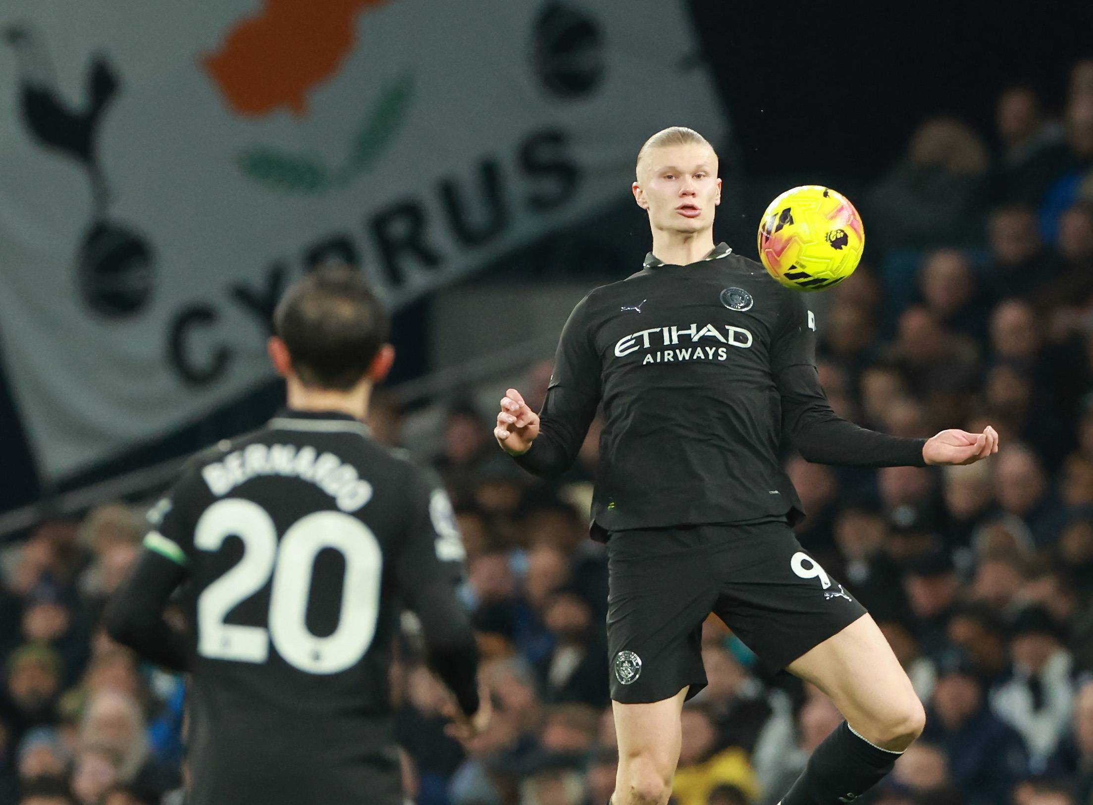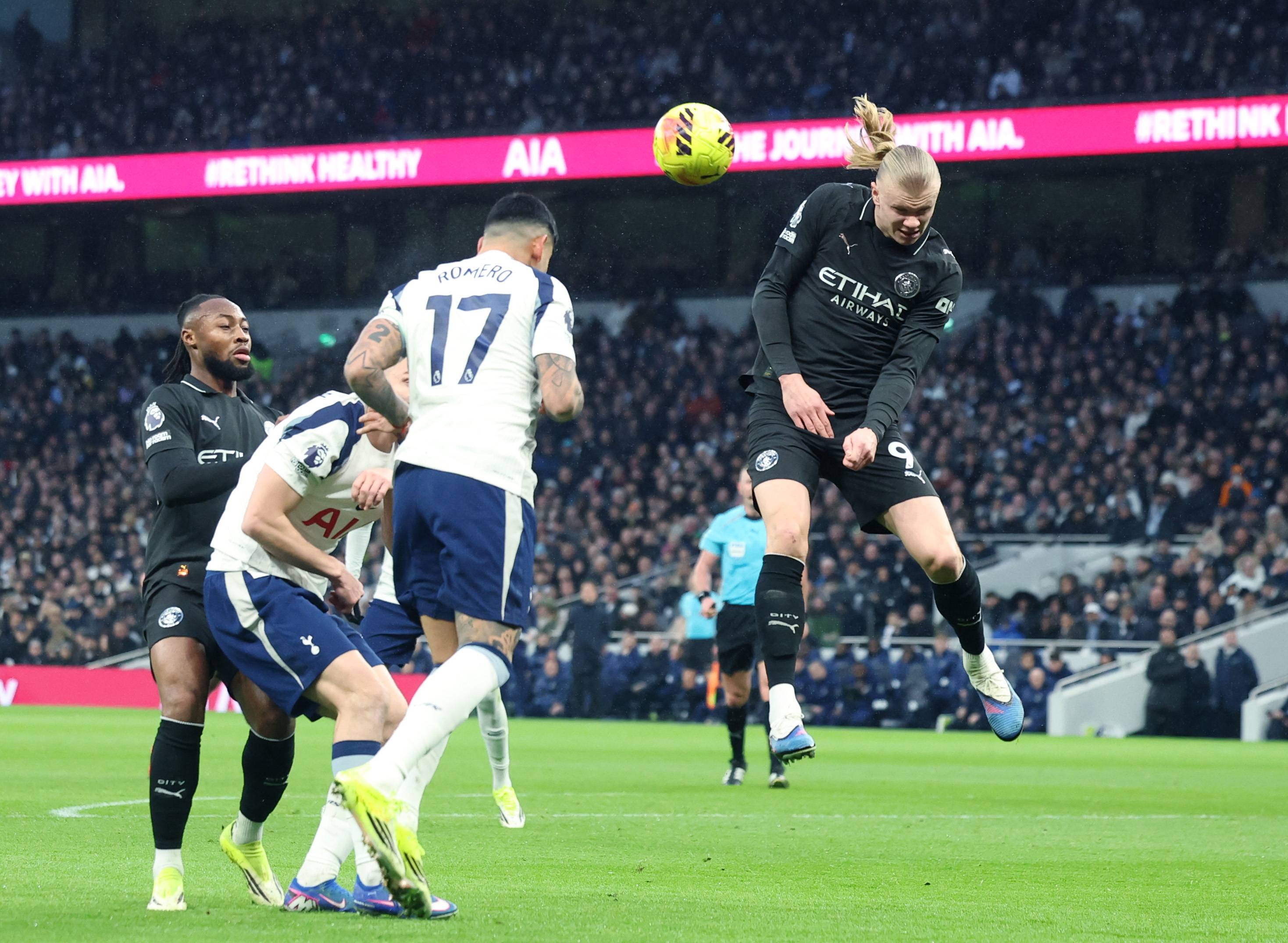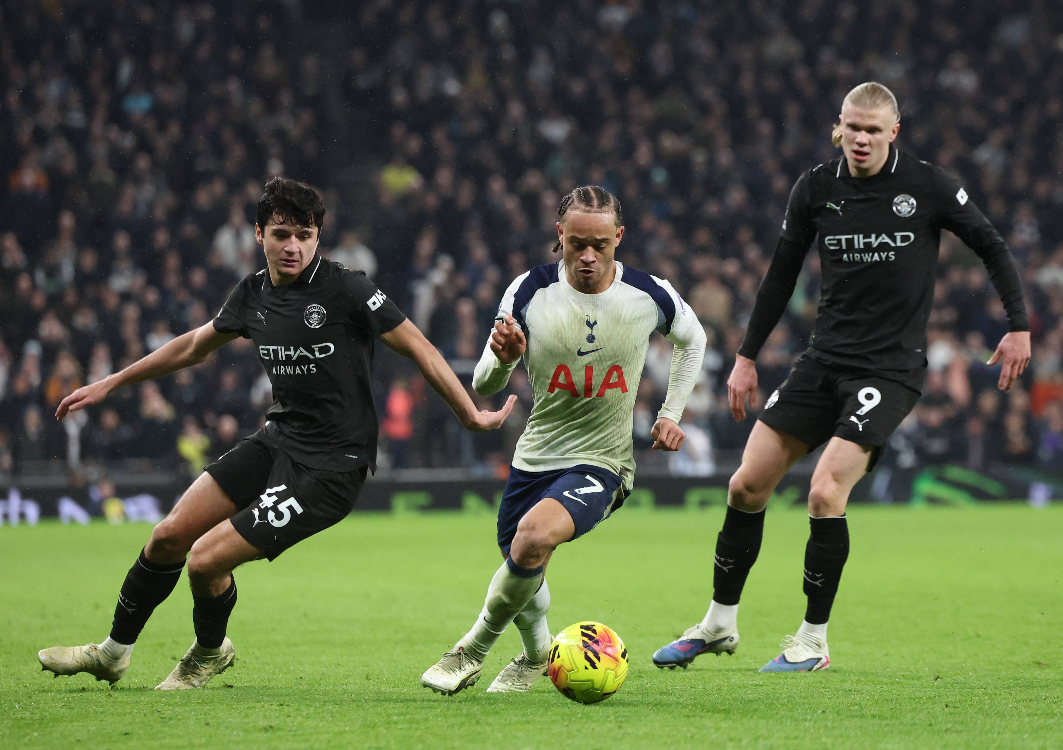 เมื่อวันที่ 1 กุมภาพันธ์ แฮร์รี่ วิงค์ส ของท็อตแน่ม ฮ็อตสเปอร์ (กลาง) เข้าปะทะกับ ริยาด มาห์เรซ ของแมนเชสเตอร์ ซิตี้ (ซ้าย) และ เออร์ลิง ฮาแลนด์ ระหว่างการแย่งบอล ซินหัว/EPA