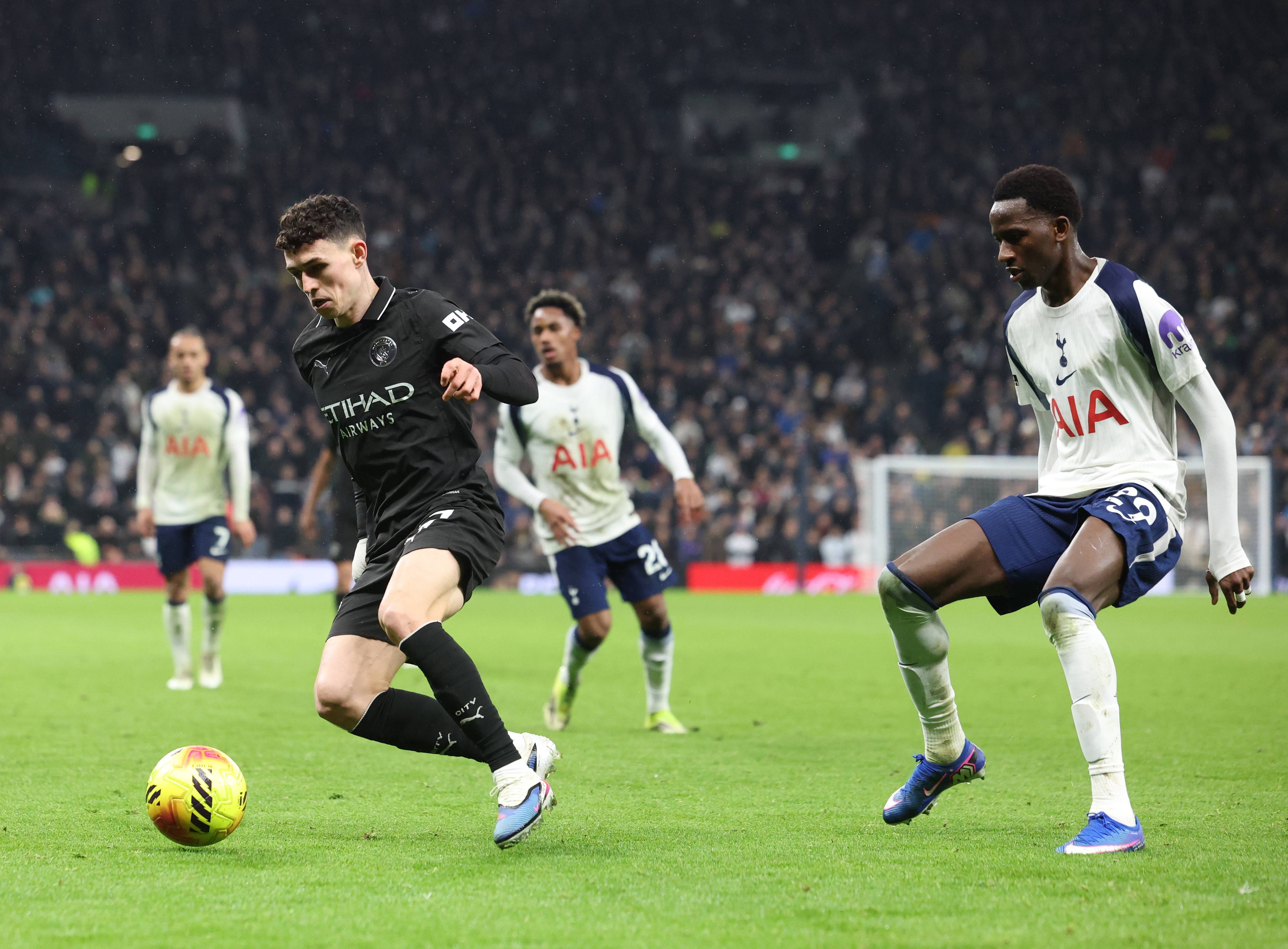 เมื่อวันที่ 1 กุมภาพันธ์ เซอร์จ อูริเยร์ ของท็อตแนม ฮอตสเปอร์ (หน้าขวา) ท้าทาย ฟิล โฟเดน ของแมนเชสเตอร์ ซิตี (หน้าซ้าย) เพื่อแย่งบอล. ซีเอ็นเอ็น/อีพีเอ