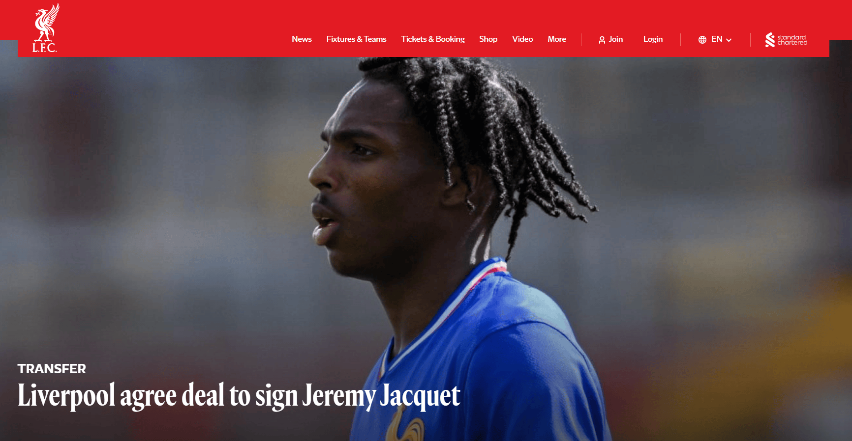 สโมสรลิเวอร์พูลได้ประกาศว่า ได้บรรลุข้อตกลงกับสโมสรสตาด รัวเนส์ สำหรับการย้ายทีมของเจเรมี จาคเกต์ กองหลังรายนี้จะเข้าร่วมสโมสรก่อนฤดูกาล 2026-27 โดยขึ้นอยู่กับการดำเนินการขอใบอนุญาตทำงานและขั้นตอนทางการโอนย้ายระหว่างประเทศให้เสร็จสมบูรณ์