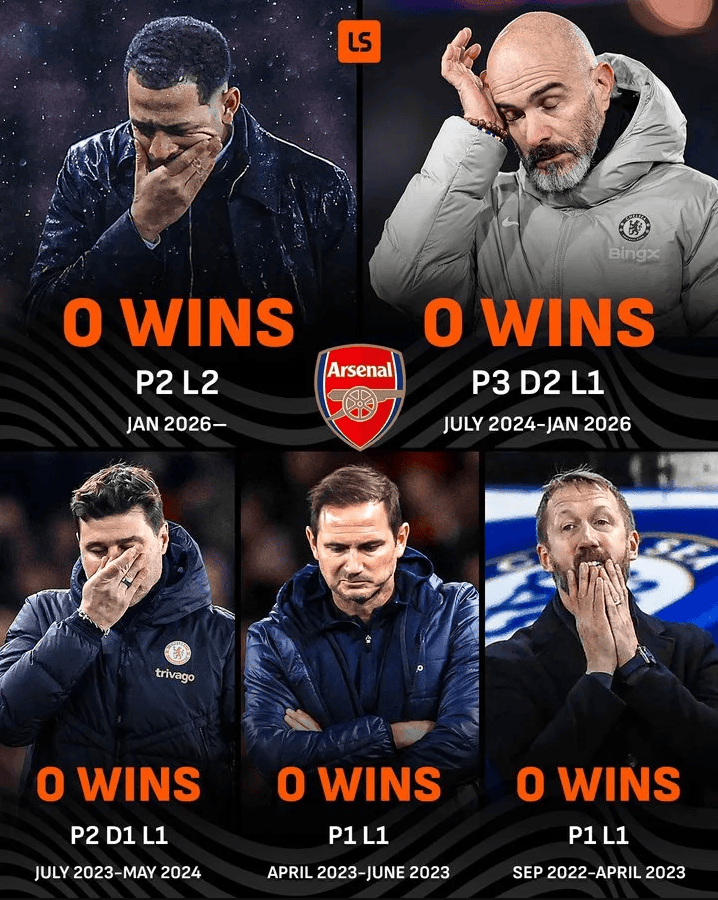 ผู้จัดการทีมเชลซีทั้งห้าคนที่ระบุไว้ข้างต้นได้ดูแลทีมในช่วงเวลาที่สโมสรไม่สามารถเอาชนะอาร์เซนอลได้ถึงเก้าครั้งติดต่อกัน ที่จริงแล้ว ทีมบลูส์ยังแพ้ในนัดสุดท้ายภายใต้การคุมทีมของอดีตผู้จัดการ โทมัส ทูเคิล กับทีมปืนใหญ่ (แพ้คาบ้าน 2-4 ในพรีเมียร์ลีกเมื่อเดือนเมษายน 2022) ทำให้สถิติไม่ชนะติดต่อกันเพิ่มขึ้นเป็นสิบนัด