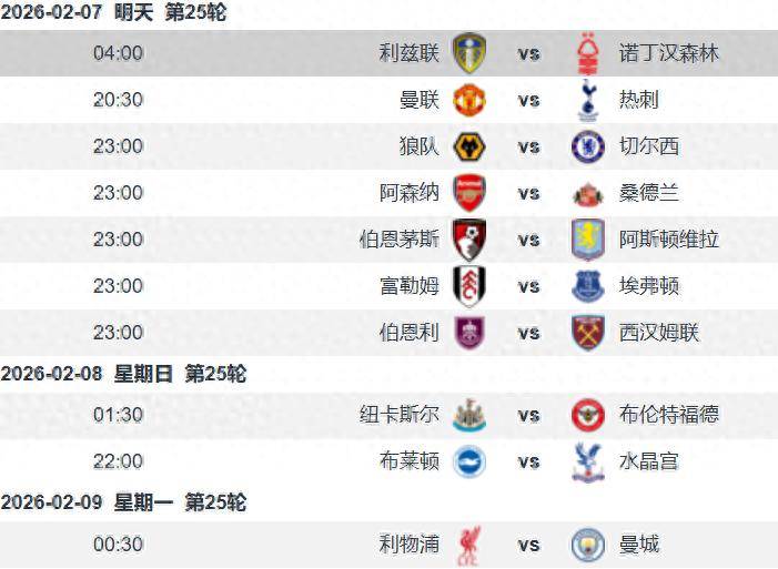 เวลา 04:00 น. ตามเวลาปักกิ่ง วันที่ 7 กุมภาพันธ์ การแข่งขันพรีเมียร์ลีก นัดที่ 25 ได้เริ่มต้นขึ้นด้วยการแข่งขันนัดแรกที่ลีดส์ ยูไนเต็ด เปิดบ้านต้อนรับการมาเยือนของน็อตติงแฮม ฟอเรสต์