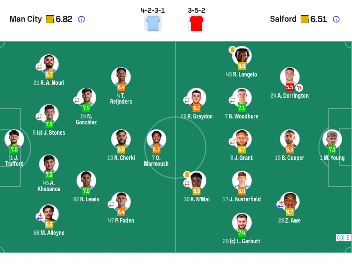 แมนเชสเตอร์ ซิตี้ ตัวจริง: 1-แทรฟฟอร์ด, 45-ฮุสซาโนฟ, 5-สโตนส์ (64' 15-เกเย่), 68-อาลาอี (22' 56-แมคอาดู), 21-นูรี (64' 33-โอไรลีย์), 14-นิโก้ (75' 16-โรดรี),82-ลูอิส, 4-ไรนเดิร์ตส์, 47-โฟเดน (64' 42-เซเมโด), 10-เชอร์กี, 7-มาร์มูช.