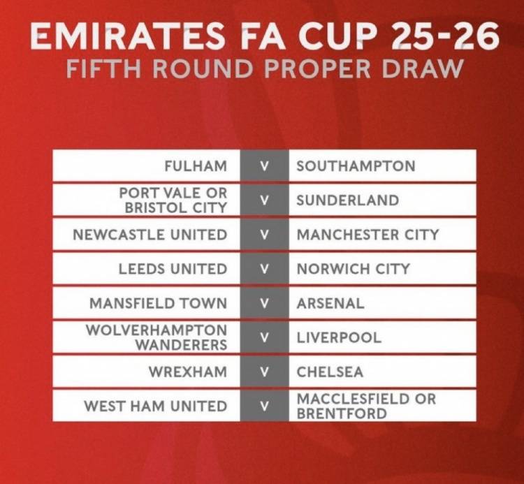 เมื่อวันที่ 17 กุมภาพันธ์ ได้มีการประกาศการแข่งขันรอบ 16 ทีมสุดท้ายของเอฟเอคัพ: แมนเชสเตอร์ ซิตี้ จะพบกับ นิวคาสเซิล ยูไนเต็ด ขณะที่ อาร์เซนอล จะพบกับ มานส์ฟิลด์ ทาวน์ ทีมจากลีกวัน