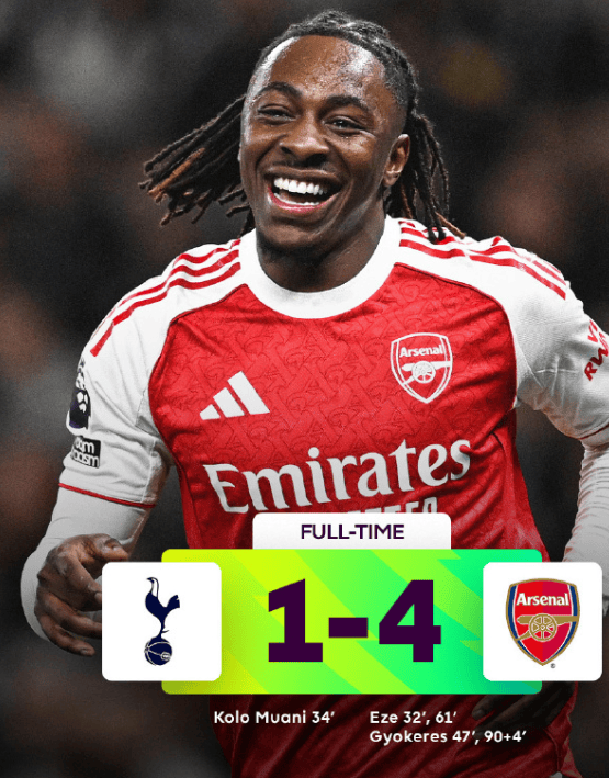 อาร์เซนอลคว้าชัยชนะเหนือสเปอร์สสองนัดรวดด้วยสกอร์ 4-1; เอเซและเอ็นเคเทียห์นำทัพคว้าชัย ทิ้งห่างห้าแต้มท่ามกลางความกังวลที่ยังคงอยู่ _แมนเชสเตอร์ ยูไนเต็ด_ แมนเชสเตอร์ ซิตี้_ ลิเวอร์พูล