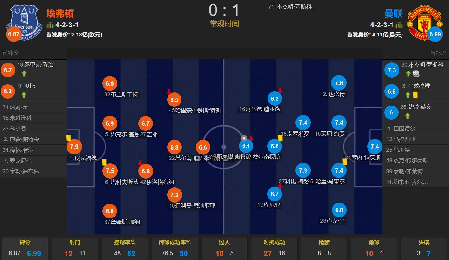 เอฟเวอร์ตัน พบ แมนเชสเตอร์ ยูไนเต็ด: มอยส์จัดทัพระบบ 4-2-3-1 ดวลอดีตต้นสังกัด โดย 11 ตัวจริงมีมูลค่ารวม 213 ล้านยูโร;คาร์ริคใช้แผนการเล่น 4-2-3-1 โดยมีเอ็มบูโม่เป็นกองหน้าตัวเป้า พร้อมด้วยเฟอร์นันเดสสนับสนุนอยู่ด้านหลัง คูนญ่าและอามาดประจำการในตำแหน่งริมเส้น ขณะที่เมโน่และคาเซมิโร่จับคู่กันในแดนกลาง กองหลังสี่คนประกอบด้วยลุค ชอว์, แม็กไกวร์, โยโล่ และดาล็อต โดยมีแรมสสันส์เฝ้าเสา ผู้เล่นตัวจริงมีมูลค่ารวม 411 ล้านยูโร