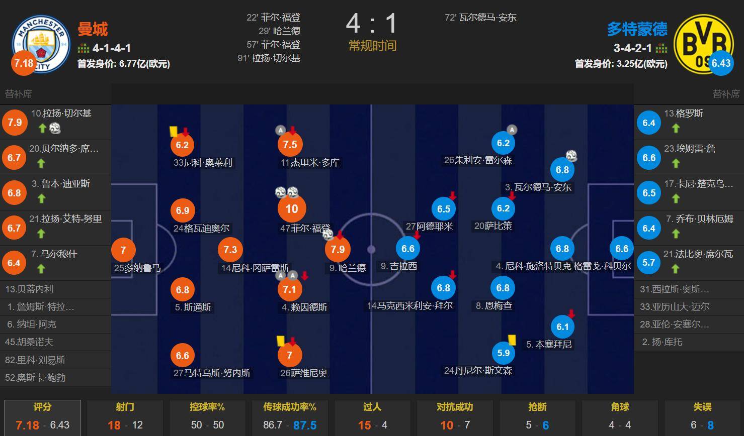 ในครึ่งแรก รีเดอร์สช่วยฟอเดนทำประตูเบิกร่องด้วยการยิงไกล ขณะที่ดokuช่วยฮาแลนด์ทำประตูที่สองด้วยการยิงอย่างรุนแรงใส่สโมสรเก่าของเขา ทำให้แมนเชสเตอร์ ซิตี้ นำ 2-0 ในช่วงพักครึ่ง หลังจากพักครึ่ง ฟอเดนทำประตูที่สองของเขา รีเดอร์สทำแอสซิสต์สองครั้ง และแอนตันทำประตูให้โบรุสเซีย ดอร์ทมุนด์ตีตื้นขึ้นมา ขณะที่ชาร์คีทำประตูในฐานะตัวสำรอง