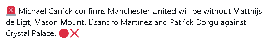 ผู้จัดการทีมแมนเชสเตอร์ ยูไนเต็ด ไมเคิล คาร์ริค เปิดเผยว่าไม่มีผู้เล่นบาดเจ็บทั้งสี่คน ได้แก่ เมสัน เมาท์, ลิซานโดร มาร์ติเนซ, มัตไธส์ เดอ ลิกต์ และแพทริค ดูกบา พร้อมลงสนามในเกมพรีเมียร์ลีกสุดสัปดาห์นี้กับคริสตัล พาเลซในจำนวนนี้ มิดฟิลด์มูลค่า 60 ล้านปอนด์อย่างเมานต์ได้กลับมาฝึกซ้อมแล้ว และคาดว่าจะกลับมาลงสนามได้ในนัดเยือนต่อไปกับนิวคาสเซิล ยูไนเต็ด แม้ว่าเอ็มบูโมจะถูกเปลี่ยนตัวออกเนื่องจากบาดเจ็บในเกมกับเอฟเวอร์ตัน แต่เขายังคงพร้อมให้เลือกใช้งานได้