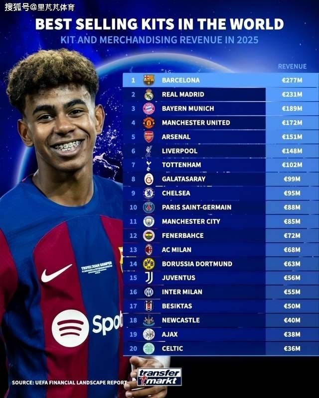 Transfermarkt ได้รวบรวมตัวเลขรายได้จากการขายเสื้อในปี 2025 ของสโมสรใหญ่ ๆ ไว้แล้ว บาร์เซโลนาเป็นผู้นำด้วยจำนวน 277 ล้านยูโร ตามมาด้วยเรอัล มาดริด ที่ 231 ล้านยูโร – สองสโมสรใหญ่จากลาลีกาเพียงสองทีมที่สามารถทำรายได้จากการขายเสื้อเกิน 200 ล้านยูโรบาเยิร์น มิวนิก อยู่ในอันดับที่สามด้วยมูลค่า 189 ล้านยูโร, แมนเชสเตอร์ ยูไนเต็ด อยู่ในอันดับที่สี่ด้วยมูลค่า 172 ล้านยูโร, และอาร์เซนอล อยู่ในอันดับที่ห้าด้วยมูลค่า 151 ล้านยูโร. ความสามารถในการขายเสื้อของสองทีมจากพรีเมียร์ลีกยังคงอยู่ในระดับชั้นนำของยุโรป.
