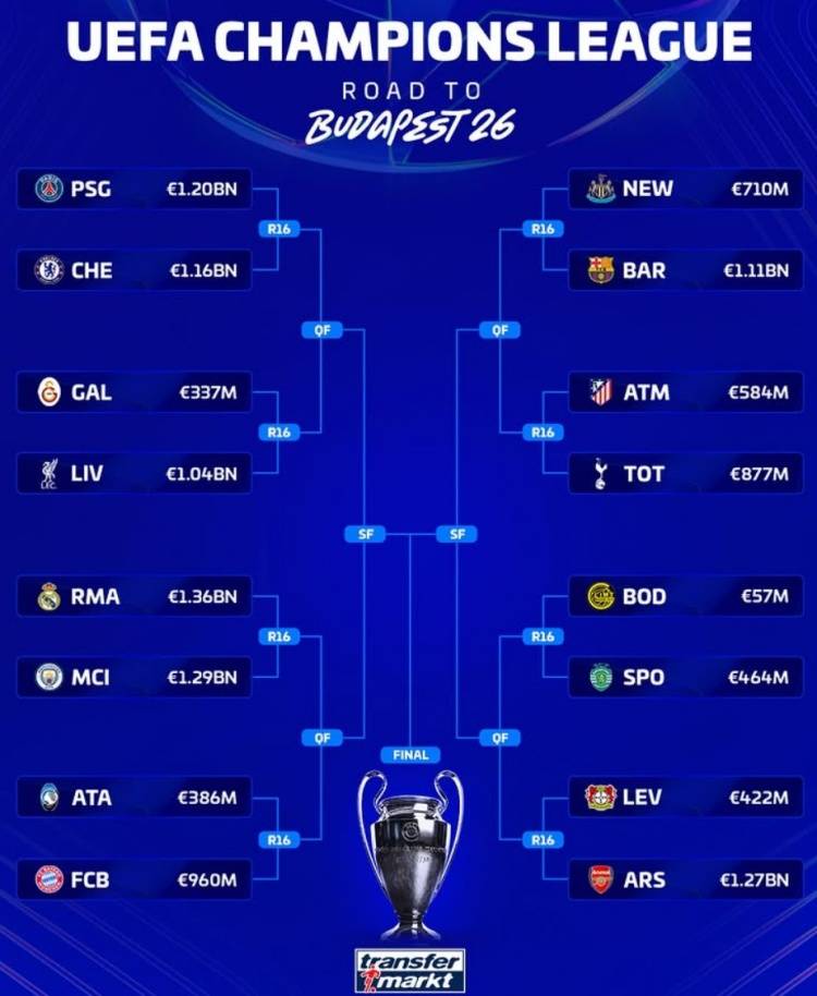 หกทีมในครึ่งบนของรอบ 16 ทีมสุดท้ายของแชมเปียนส์ลีก มีมูลค่ารวมกันเกินกว่า 900 ล้านยูโร ขณะที่บาร์เซโลนาและอาร์เซนอลในครึ่งล่างมีมูลค่าเกิน 100 ล้านยูโร