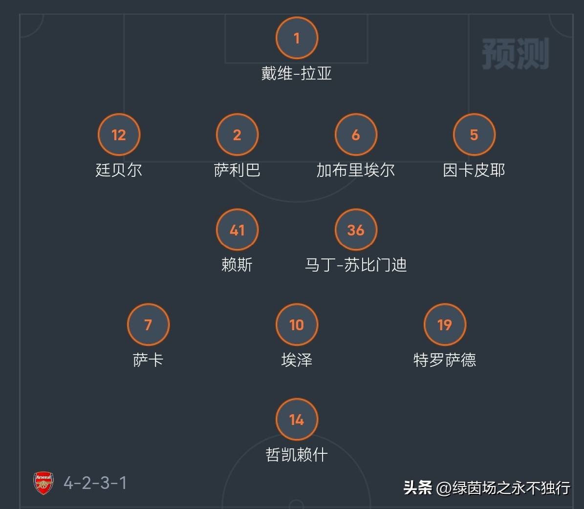 อาการบาดเจ็บหลักของอาร์เซนอลในขณะนี้คือ เมรีโน่ และ ฮาแวร์ตซ์ โดยผู้เล่นตัวจริงคนอื่นๆ พร้อมสำหรับการคัดเลือก อาร์เซนอลคาดว่าจะลงสนามในระบบ 4-2-3-1