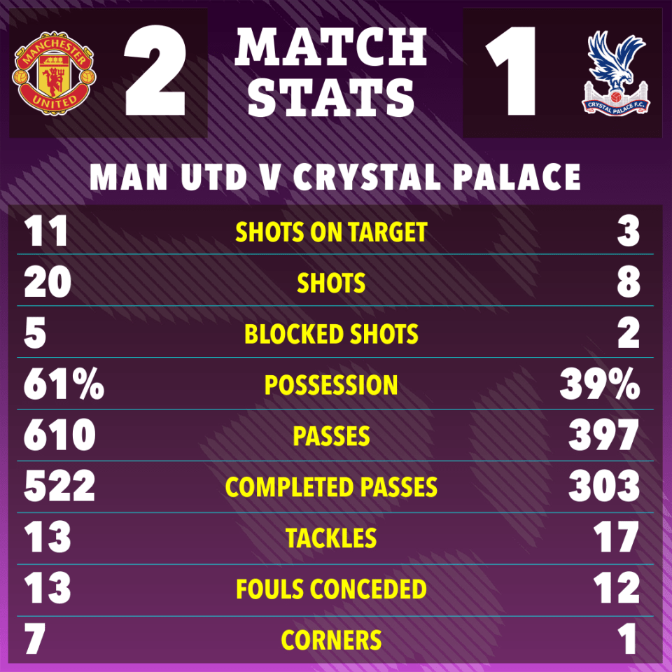 แมนเชสเตอร์ ยูไนเต็ด พลิกกลับมาเอาชนะคริสตัล พาเลซ 2-1 ที่สนามโอลด์ แทรฟฟอร์ด แซงแอสตัน วิลล่า ขึ้นไปอยู่อันดับสามในตารางพรีเมียร์ลีก บรูโน่ แฟร์นันด์ส โชว์ฟอร์มโดดเด่นในครึ่งหลัง โดยยิงจุดโทษตีเสมอ ก่อนจ่ายให้เชย์ เซสเซยง ยิงประตูชัย ซึ่งเป็นแอสซิสต์ที่ 100 ของเขาให้กับปีศาจแดง