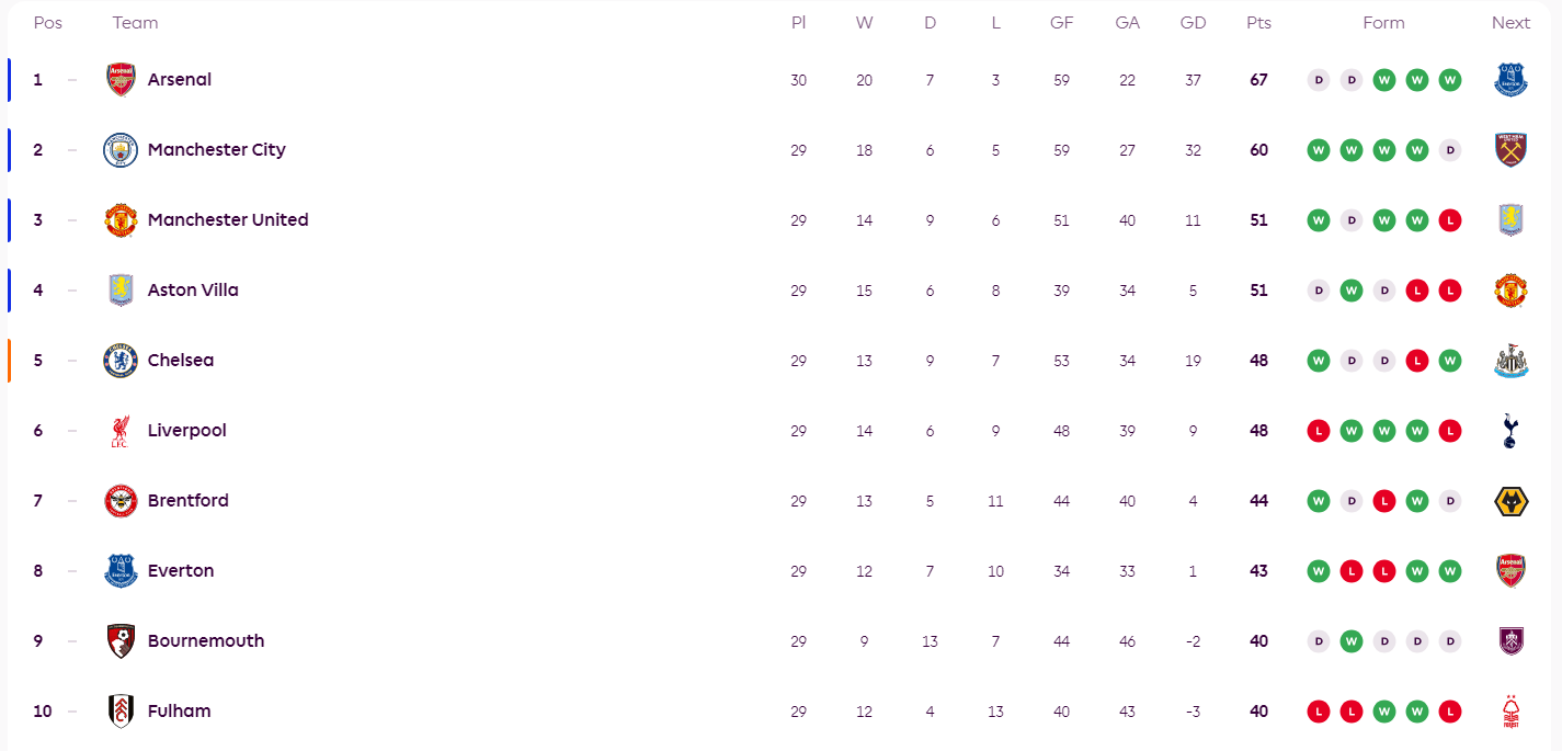 สิ่งนี้นำไปสู่ 51 แต้มในปัจจุบันในแมนเชสเตอร์ยูไนเต็ดและเวร่าและปีศาจแดงอยู่ในอันดับที่สามชั่วคราวด้วยผลต่างประตู เชลซีและลิเวอร์พูลเสมอกันด้วยคะแนน 48 แต้ม และเดอะบลูส์อยู่ในอันดับที่ห้าชั่วคราวด้วยผลต่างประตู ช่องว่างระหว่างสี่ทีมนี้มีเพียง 3 แต้ม และการต่อสู้ทั้งห้าครั้งก็ทวีความรุนแรงขึ้น
