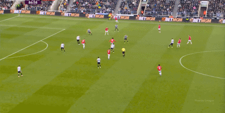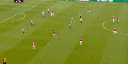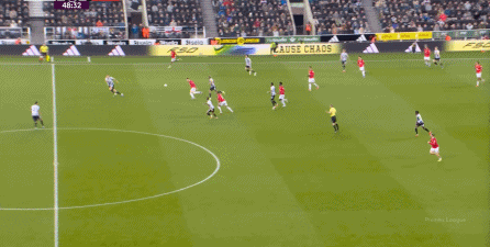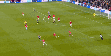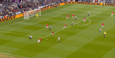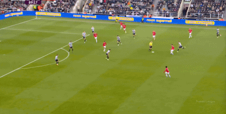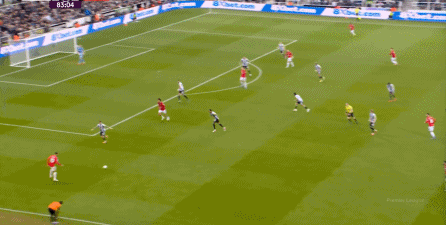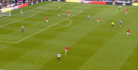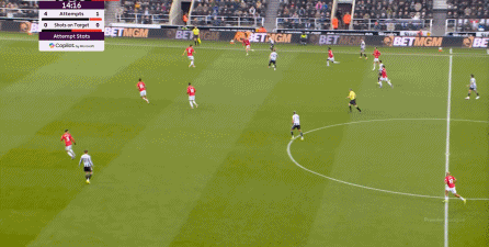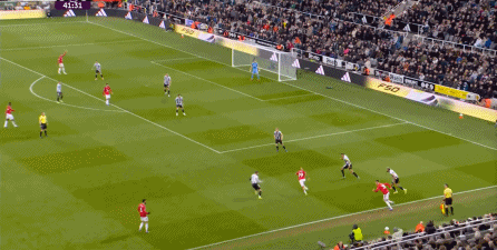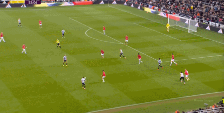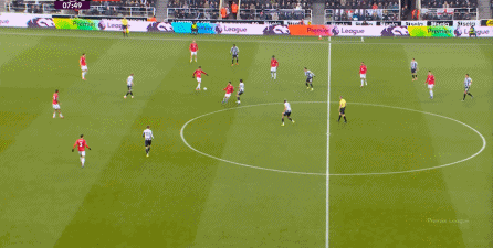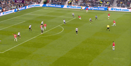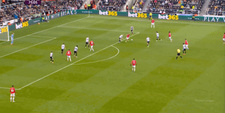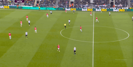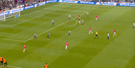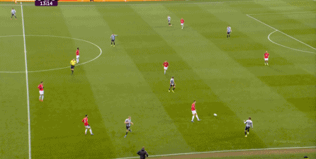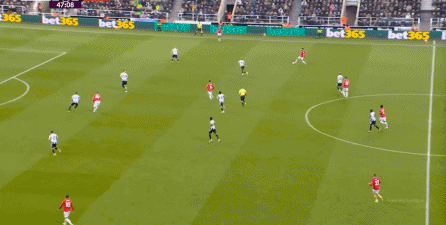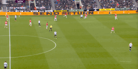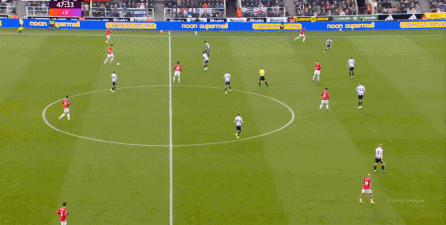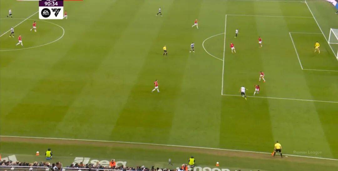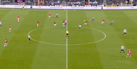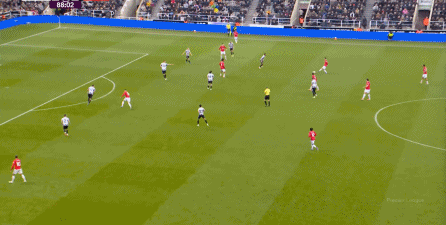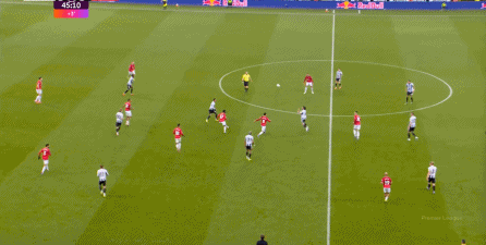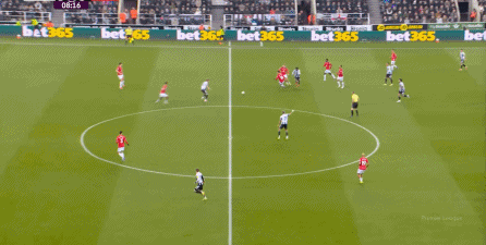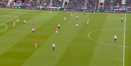 ก่อนและหลัง 30 นาที ความเข้มของนิวคาสเซิ่ลก็ลดลงในระดับหนึ่ง การเผชิญหน้าและข้อได้เปรียบในการวิ่งของพวกเขาในพื้นที่กองกลางนั้นไม่ชัดเจนเท่าเวทีเปิดอีกต่อไป และความถี่ของการเปลี่ยนบอลก็เพิ่มขึ้น แมนเชสเตอร์ ยูไนเต็ด ได้เล่นเนื้อหาบางอย่าง ตัวอย่างเช่นภายใต้การยับยั้งของแนวหน้า บรูโน่ใช้บริเวณซี่โครงเพื่อส่งผ่านด้านหน้าไปยังด้านหน้าหลังจากออกจากตำแหน่งเอวด้านหน้า คราวนี้เขาพบเชชโกและคูเนียและโจมตีต่อหน้าเป้าหมาย: