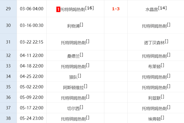 ในวันที่ 6 มีนาคม ตามเวลาปักกิ่ง ในเกมสุดท้ายของรอบ 29 ของพรีเมียร์ลีก ท็อตแนมเล่นกับคริสตัล พาเลซที่บ้าน และท็อตแนมเป็น 1 แต้มก่อนเกมตกชั้นก่อนเกม พวกเขาต้องการชัยชนะอย่างเร่งด่วนเพื่อกำจัดภัยคุกคามจากการตกชั้น ส่งผลให้ท็อตแนมแพ้ 1-3 ให้กับคริสตัล พาเลซ และแพ้ 5 เกมรวดในลีก
