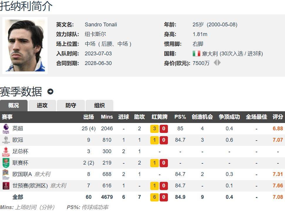 Tonali อายุ 25 ปี สูง 1.81 เมตร นักเตะเท้าขวาที่เน้นกองกลางก็สามารถเล่นกองกลางได้เช่นกัน ราคาโดยประมาณ 75 ล้านยูโร สัญญากับนิวคาสเซิลจะเป็น 29 เกมในพรีเมียร์ลีกฤดูกาลนี้ 2 แอสซิสต์ 29 เกมในพรีเมียร์ลีก 1 ลูกและ 1 แอสซิสต์ในเอฟเอคัพ 3 เกมและ 1 แอสซิสต์ 4 เกมและ 2 แอสซิสต์ในแต่ละเกม