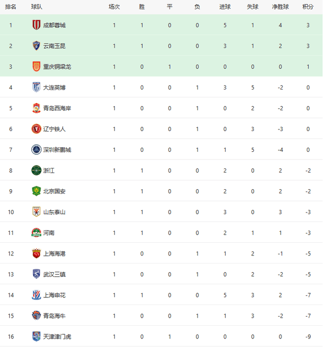 เมื่อวันที่ 8 มีนาคม ตามเวลาปักกิ่ง รอบแรกของ Chinese Super League สิ้นสุดลง และปักกิ่ง Guoan เอาชนะสามเมืองของหวู่ฮั่นได้ 2-0 หลังจากรอบนี้ ซานตง ไทซาน ติดอันดับเหนือท่าเรือเซี่ยงไฮ้ เฉิงตู หงเฉิง ได้อันดับหนึ่ง พวกเขาชนะรอบแรกและได้ 4 ประตู เทียนจิน จินเหมิน ไทเกอร์ ทำแต้มได้ 1 แต้มในรอบแรก -9 แต้ม อันดับสุดท้าย ชิงเต่า แมนที แพ้ 1-3 อันดับสองรองจาก