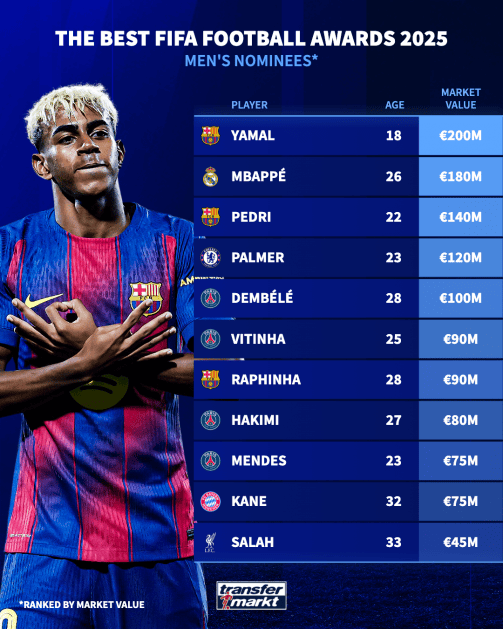 เมื่อวันที่ 7 พฤศจิกายน ตามเวลาปักกิ่ง ฟีฟ่าได้ประกาศรายชื่อผู้เข้าชิงรางวัลนักเตะยอดเยี่ยมแห่งปีของฟีฟ่าชาย ประจำปี 2025 อย่างเป็นทางการ โดยมีผู้เล่นอย่าง อุสมาน เดมเบเล่, ยามาร์, คีเลียน เอ็มบัปเป้ และแฮร์รี เคน เป็นหนึ่งในผู้เข้าชิงรางวัลนี้ เว็บไซต์ตลาดนักเตะเยอรมัน Transfermarkt ได้จัดอันดับมูลค่าตลาดของผู้เล่นทั้ง 11 คนดังนี้:
