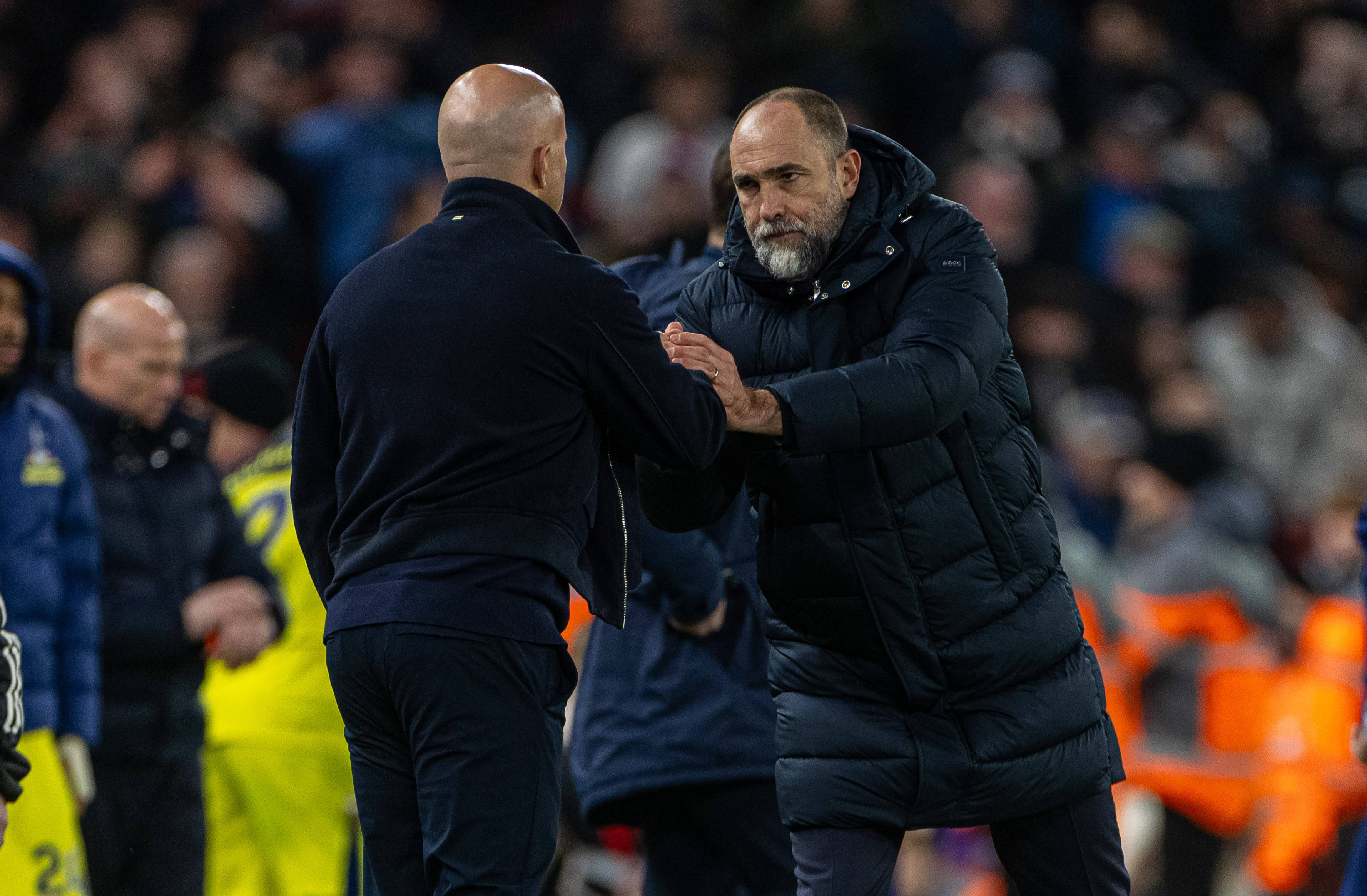 เมื่อวันที่ 15 มีนาคม โค้ชท็อตแนม ทูดอร์ (ขวา) จับมือกับสล็อตโค้ชลิเวอร์พูลหลังเกม สำนักข่าวซินหัว