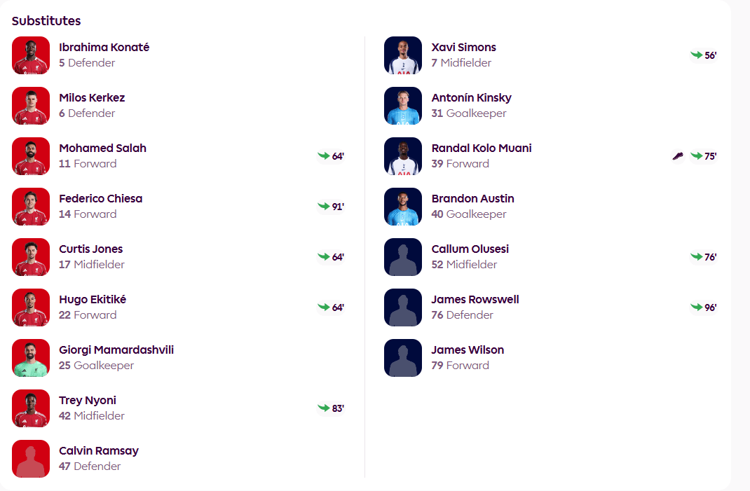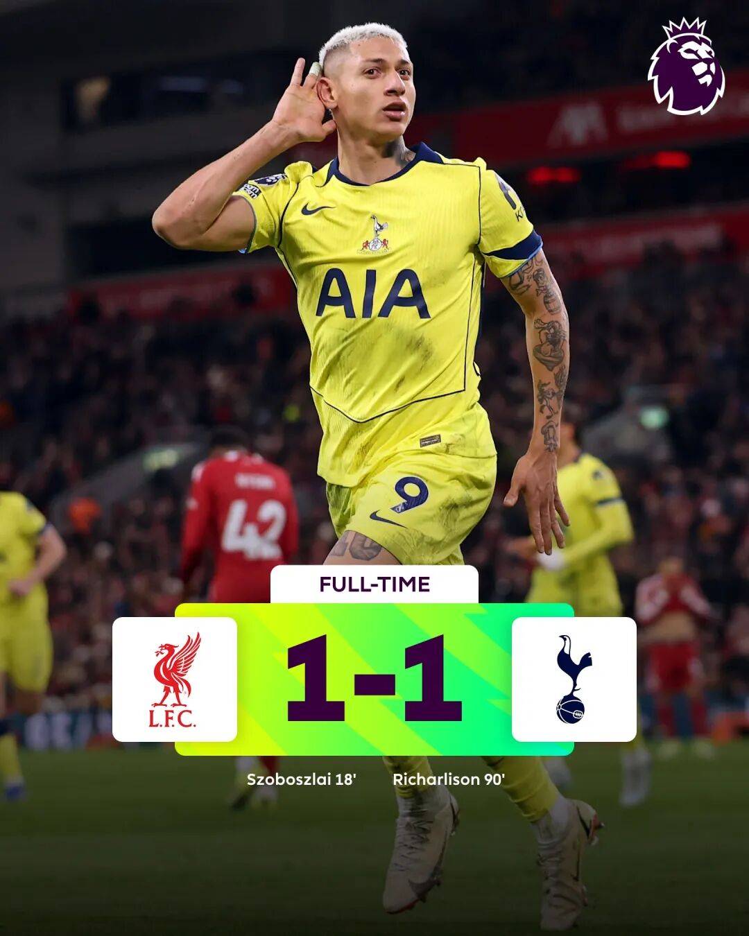 ในช่วงครึ่งหลังของเกม ริซ่า ลิซอน จบการเสมอกันในนาทีที่ 90 และท็อตแนม เสมอ 1-1 ที่ลิเวอร์พูล ทำประตูได้ 1 แต้มบนเส้นทางสู่การตกชั้น