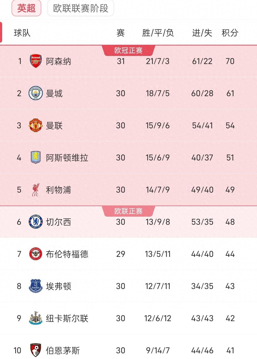 ในรอบที่ 30 ของพรีเมียร์ลีก วันที่ 16 มีนาคม ลิเวอร์พูล 1-1 โดย ท็อตแน่ม แมนเชสเตอร์ ยูไนเต็ด เอาชนะ แอสตัน วิลล่า 3-1, ฟูแล่ม 0-0 ดวน นอตติงแฮม ฟอเรสต์, คริสตัล พาเลซ 0-0 ลิซ ยูไนเต็ด, ล่าสุด พรีเมียร์ลีก ปล่อย, อาร์เซนอล 70 แต้ม 70 แต้ม, แมนเชสเตอร์ ซิตี้ โดยทั่วไปสามารถล็อค 61 แต้มที่สอง, แมนเชสเตอร์ ยูไนเต็ด ได้คะแนน 54 แต้มในคลื่นลูกสุดท้ายของสถิติชนะ และเกมสุดท้ายคือ 4 แต้ม และ 4 แต้ม