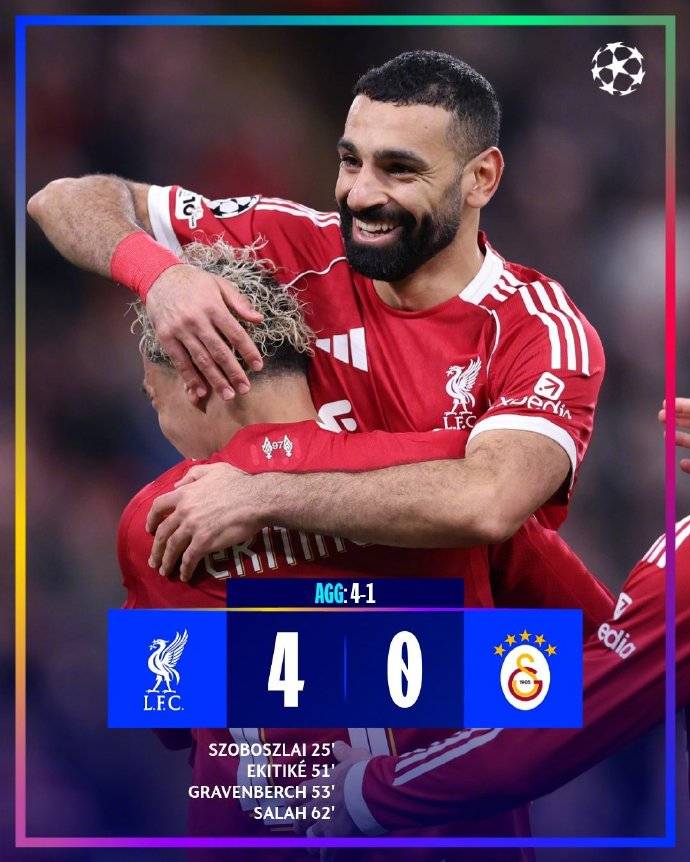 นอกจากอาร์เซนอลแล้ว ลิเวอร์พูล ยังรุกได้สำเร็จ ทีมเยือน 0-1 จากกาลาตาซาราย กลับบ้าน 4-0 ฝ่ายตรงข้ามได้รับการเลื่อนตำแหน่งที่บ้านซึ่งถือได้ว่าเป็นความเกลียดชัง 1-0 ของคู่ต่อสู้ในฤดูกาลนี้ถึง 2 ครั้งและในเวลาเดียวกันก็พิสูจน์ให้เห็นถึงพลังของทีมที่บ้าน ลิเวอร์พูลพลิกกลับ 4-1 รอบรองชนะเลิศแชมเปี้ยนส์ลีก ผลงานของซาลาห์นั้นยอดเยี่ยมมาก และในที่สุดร่างระดับต้นขาก็เล่นบทบาทของมันในที่สุด