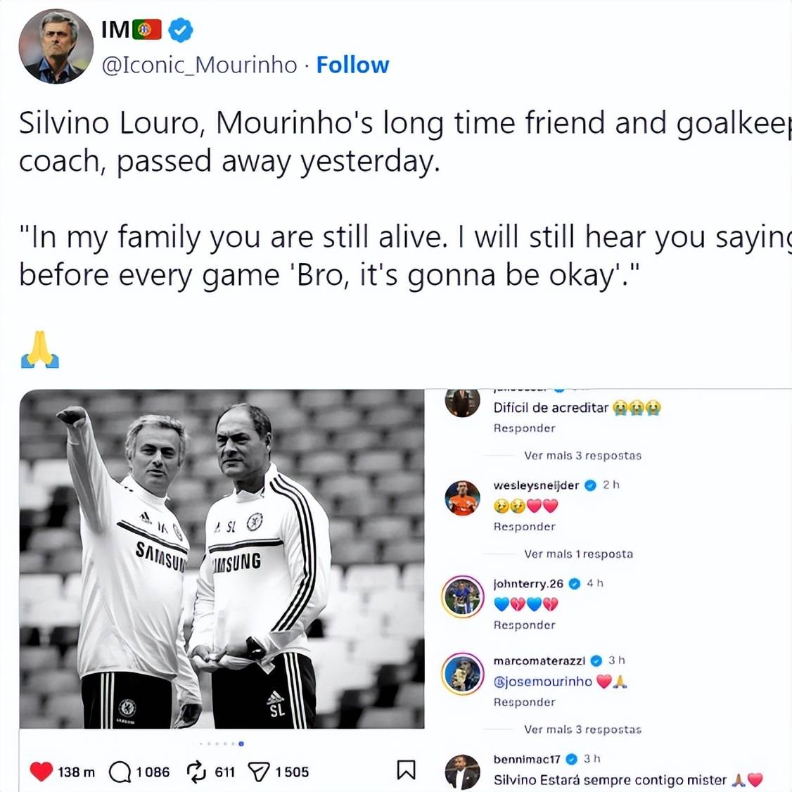 มูรินโญ่เขียนลงโซเชียลว่า “ในครอบครัว ของผม คุณยังมีชีวิตอยู่ ฉันจะยังคงได้ยินคำพูดของคุณก่อนแต่ละเกม "พี่ชาย ทุกอย่างจะเรียบร้อย"
