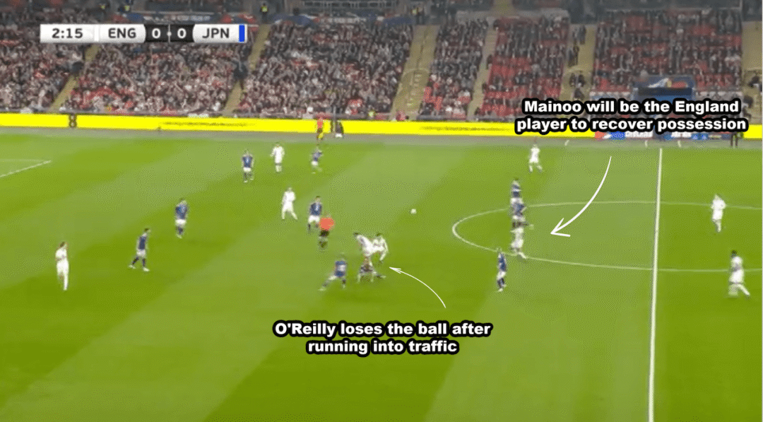 ในเวลานั้น โคล พาลเมอร์ เสียบอลในแดนหน้า และแอนเดอร์สันเสียสมาธิและล้มเหลวในการจัดการกับคู่ต่อสู้ในเวลา และเมนอยไม่ได้ติดตามใครเลย ญี่ปุ่นต่อสู้กลับและทำคะแนนได้ในที่สุด