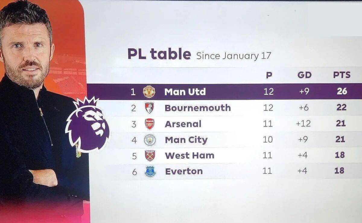 อย่างไรก็ตาม คาร์ริค ยังต้องหาทางเปลี่ยนแมนเชสเตอร์ ยูไนเต็ด ต่อไป ปีศาจแดงของเขาเผชิญหน้ากับหกทีมชั้นนำในพรีเมียร์ลีก โดยชนะสี่ทีม และยังมีโอกาสเอาชนะลิเวอร์พูลในเวลาเดียวกันได้ในเวลาเดียวกันในต้นเดือนหน้าเพื่อจบ "การฆ่า" อย่างไรก็ตาม 18 แต้มที่แมนเชสเตอร์ยูไนเต็ดทำคะแนนได้กับหกทีมแรกนั้นแพ้โดยพื้นฐานแล้วกับหกอันดับแรกและพวกเขาแพ้มากถึง 17 แต้มในตอนท้ายของรายการ