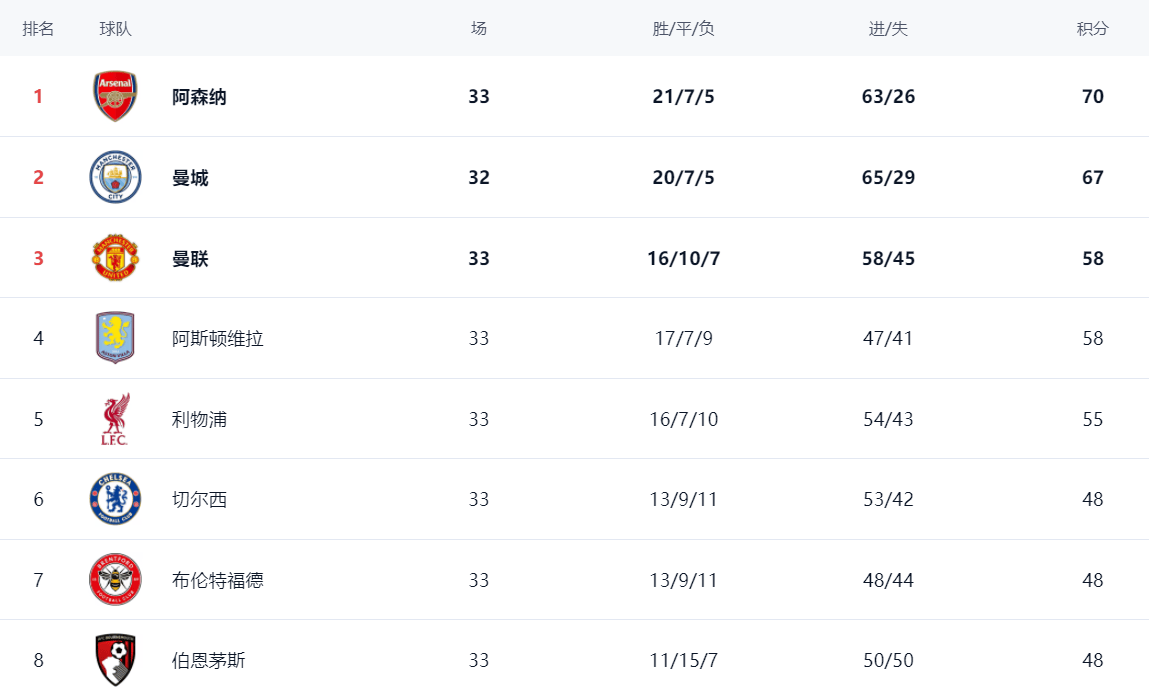 ในอันดับแม้ว่าอาร์เซนอลจะแพ้ แต่ก็ยังครองตำแหน่งสูงสุดด้วยคะแนนรวม 70 คะแนน แมนเชสเตอร์ ซิตี้ กำลังไล่ตามใกล้ขึ้นเรื่อยๆ ด้วยคะแนนรวม 67 แต้ม น้อยกว่า 3 แต้ม อาร์เซนอล ยิ่งไปกว่านั้น แมนเชสเตอร์ ซิตี้ ยังมีเกมที่น้อยกว่าหนึ่งเกม ฉันไม่ได้คาดหวังว่ารูปแบบการแข่งขันชิงแชมป์จะรุนแรงขึ้น ข้อดีที่สะสมของอาร์เซนอลถูกบริโภคอย่างต่อเนื่อง แมนเชสเตอร์ ยูไนเต็ด รั้งอันดับ 3 ด้วยคะแนน 58 คะแนน หลังจากชนะ แอสตัน วิลล่า ยังทำคะแนนได้ 58 คะแนน อยู่ในอันดับที่สี่ ลิเวอร์พูลอยู่ในอันดับที่ห้าด้วยคะแนน 55 เชลซีอยู่ในอันดับที่ 6 ด้วยคะแนน 48 คะแนน สำหรับท็อตแนม เขาได้เพียง 31 แต้ม รั้งอันดับสามจากด้านล่าง และติดอยู่ในโซนตกชั้นอย่างลึกล้ำ