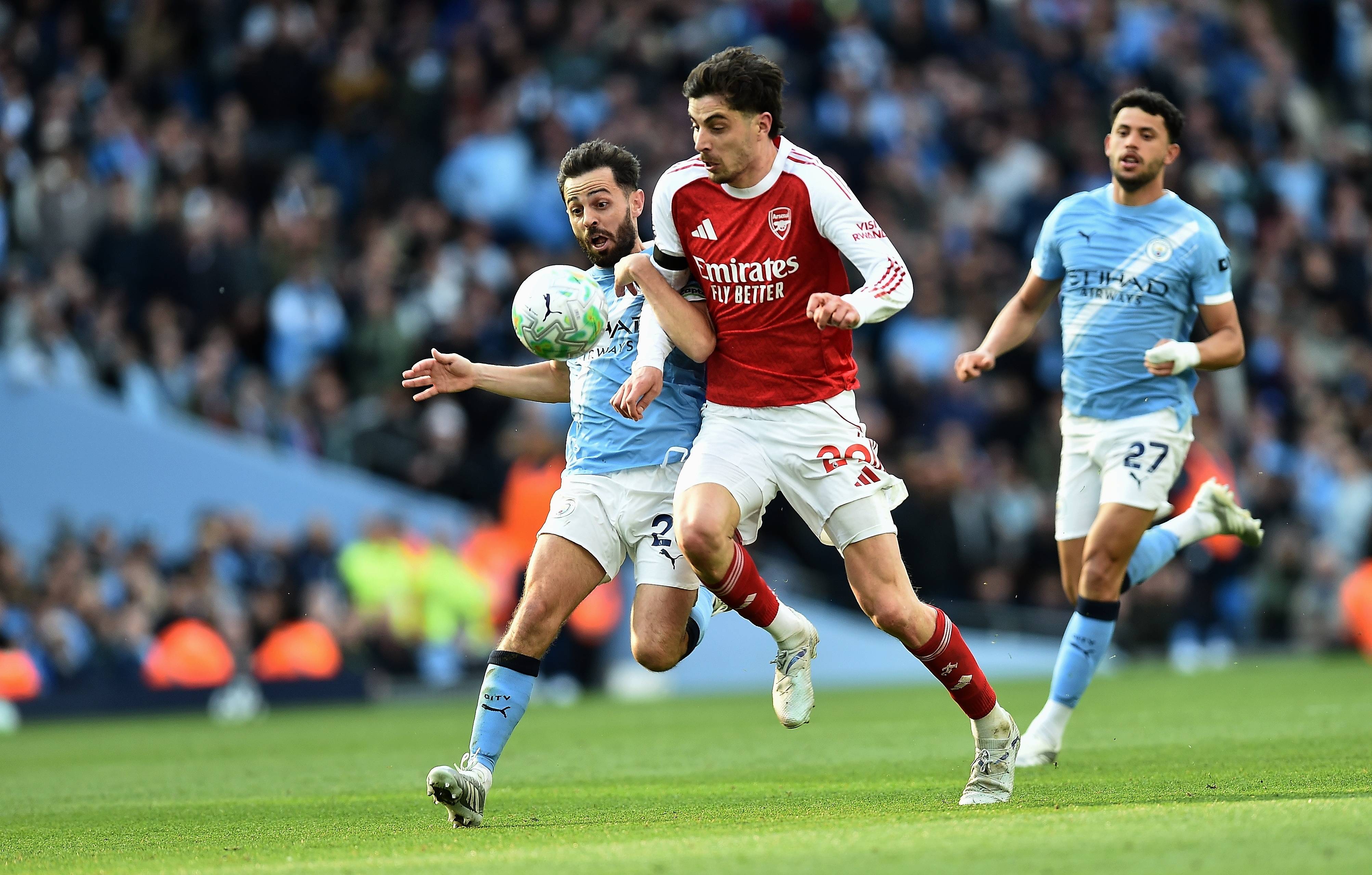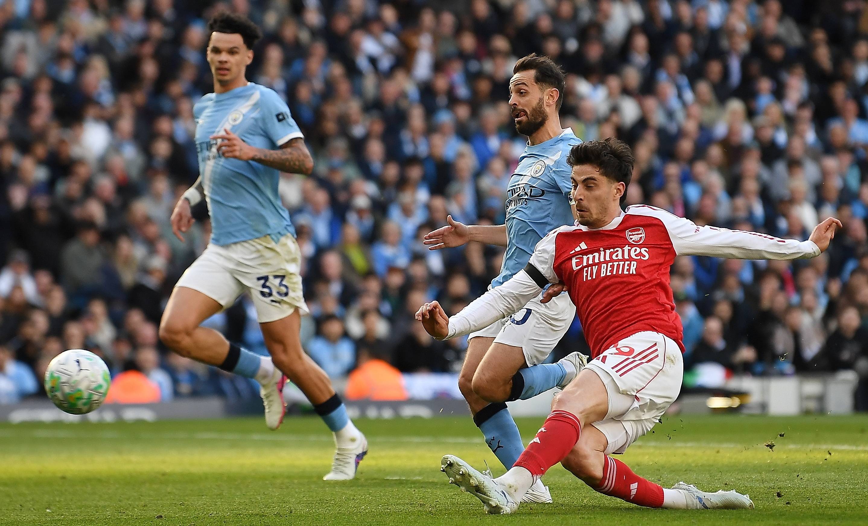 ซิลวา ผู้เล่นแมนเชสเตอร์ ซิตี้ (ซ้าย) เมื่อวันที่ 19 เมษายน ต่อสู้กับผู้เล่นอาร์เซนอล ฮาเวอร์ตซ์ สำนักข่าวซินหัว/OU XIN