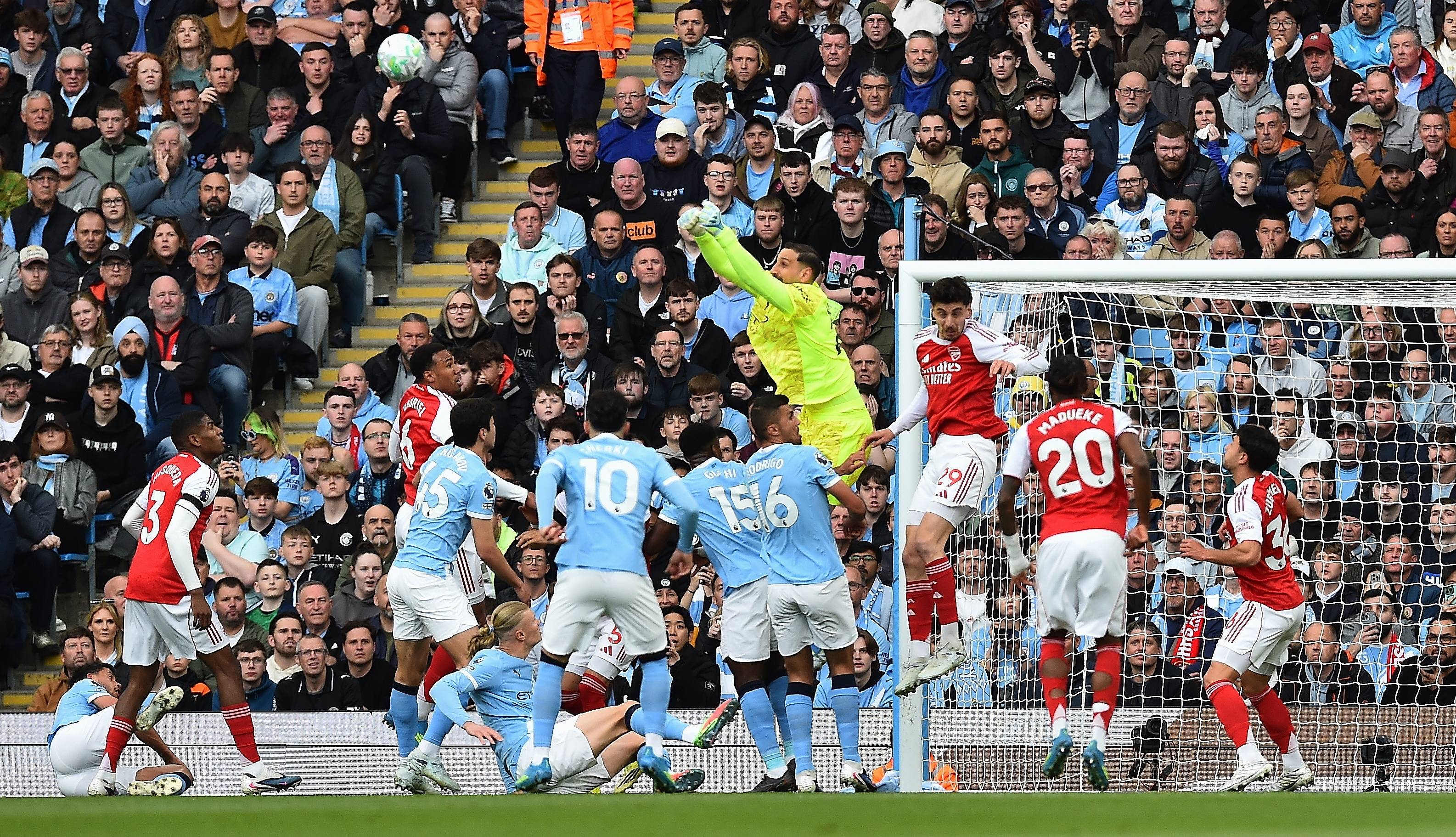 ดอนนารุมม่า ผู้รักษาประตูของแมนเชสเตอร์ ซิตี้ (กลาง) เมื่อวันที่ 19 เมษายน ต่อสู้กับผู้เล่นอาร์เซนอล ฮาเวอร์ตซ์ (ที่สามจากขวา) สำนักข่าวซินหัว/OU XIN