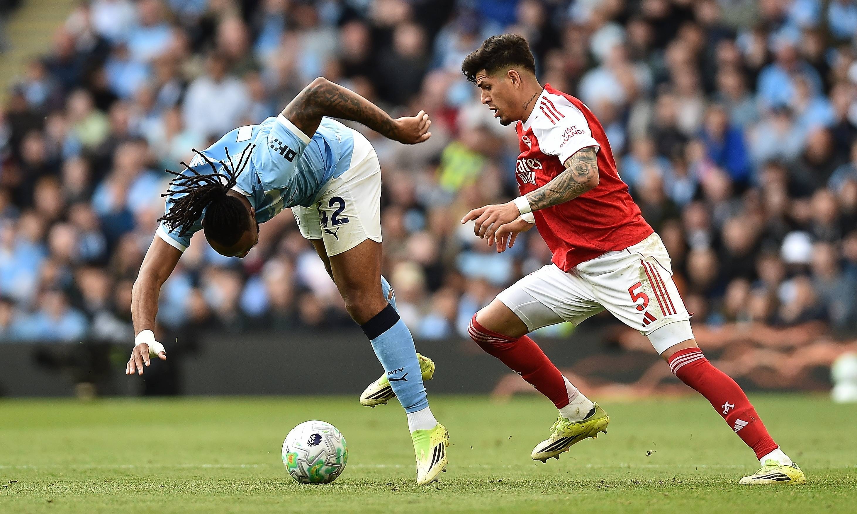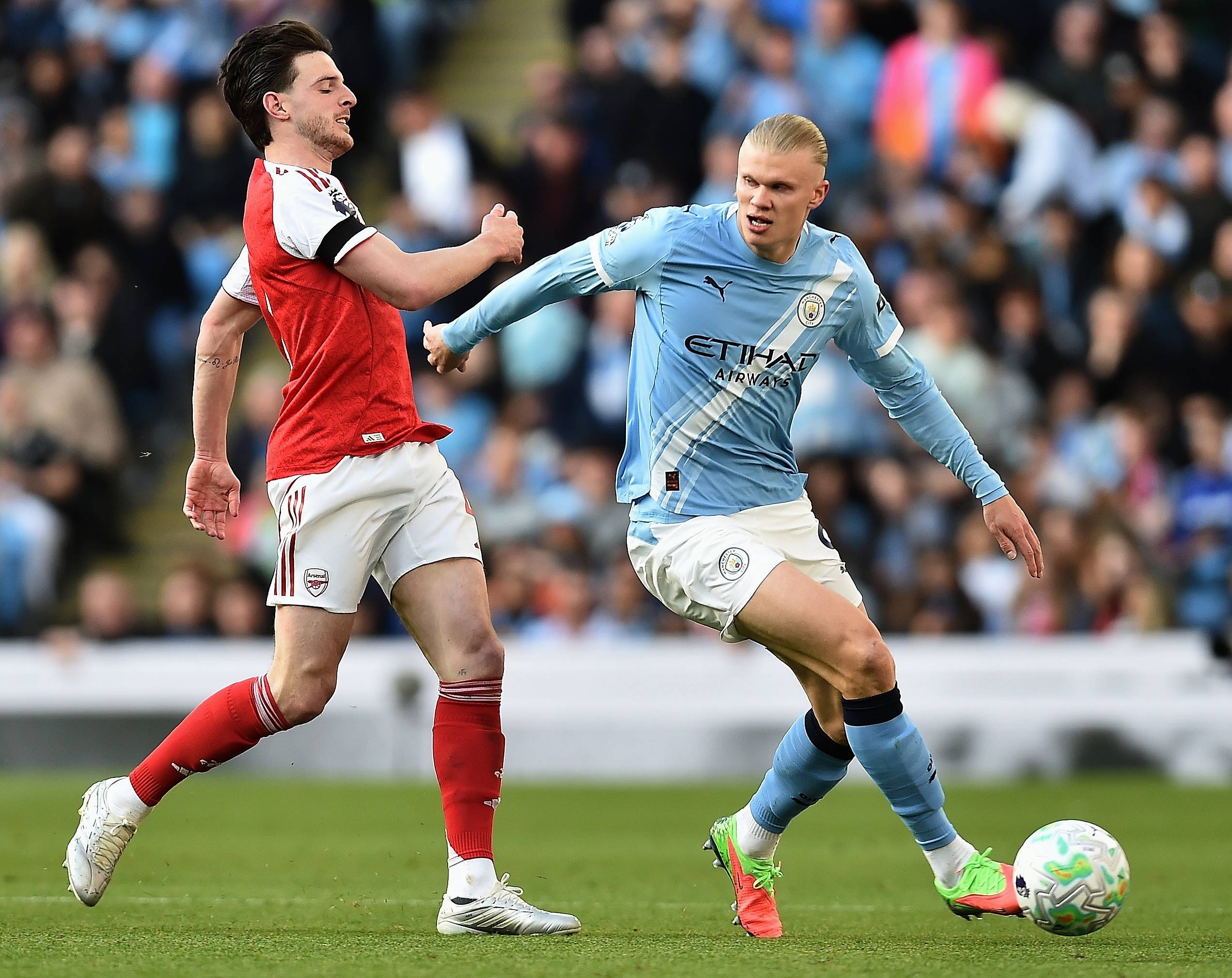ฮาร์แลนด์ นักเตะแมนฯ ซิตี้ ในวันที่ 19 เมษายน (ซ้ายกลาง) ต่อสู้กับผู้เล่นอาร์เซนอล กาเบรียล สำนักข่าวซินหัว/OU XIN