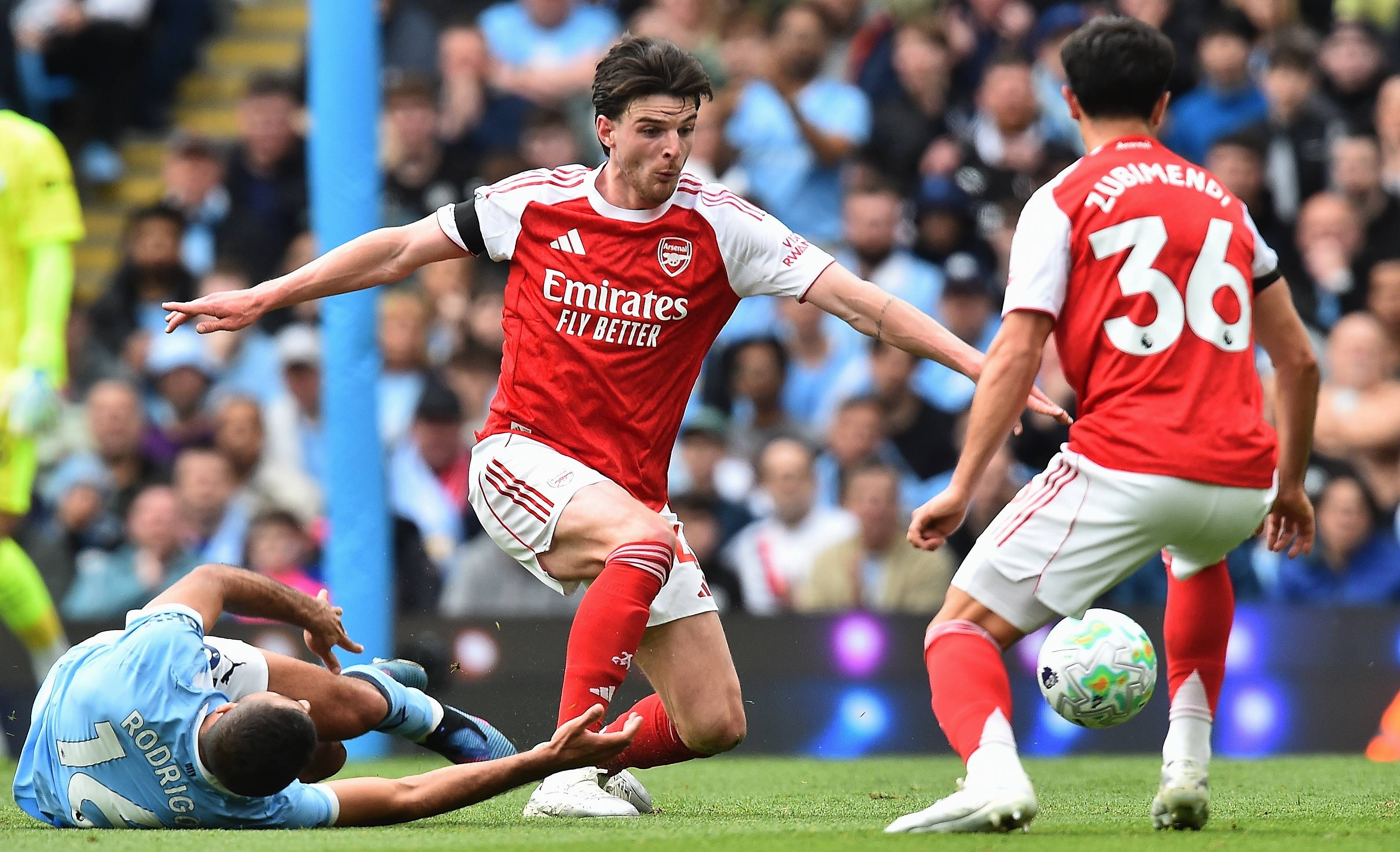 โรดรี นักเตะแมนฯ ซิตี้ (ซ้าย) เมื่อวันที่ 19 เมษายน สู้กับ อาร์เซนอล นักเตะ ไรซ์ สำนักข่าวซินหัว/OU XIN