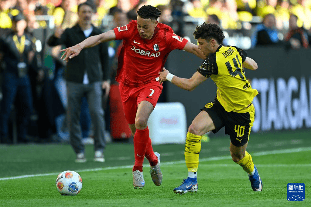เมื่อวันที่ 26 เมษายน ผู้เล่นดอร์ทมุนด์ Inasio (ขวา) และผู้เล่น Freiburg ชเชอร์ฮันท์ต่อสู้ในเกม