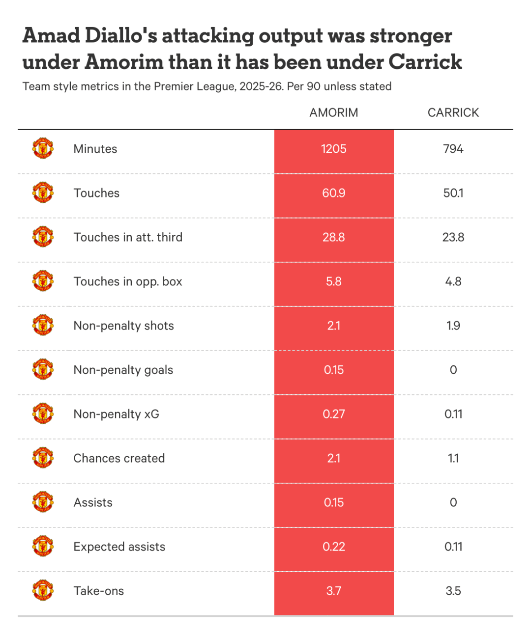 การจ้างงานกองหน้าของแมนเชสเตอร์ ยูไนเต็ด จะเป็นที่สงสัยในคืนวันจันทร์ที่บ้านกับเบรนท์ฟอร์ด แต่ถ้าตัดสินจากข้อมูลก็ไม่น่าแปลกใจที่ AMAD จะยังคงเล่นแทน เขาเป็นหนึ่งในผู้เล่นที่มีเป้าหมายน้อยที่สุดในแนวรุก ไม่ดีเท่าเมสัน เมาท์