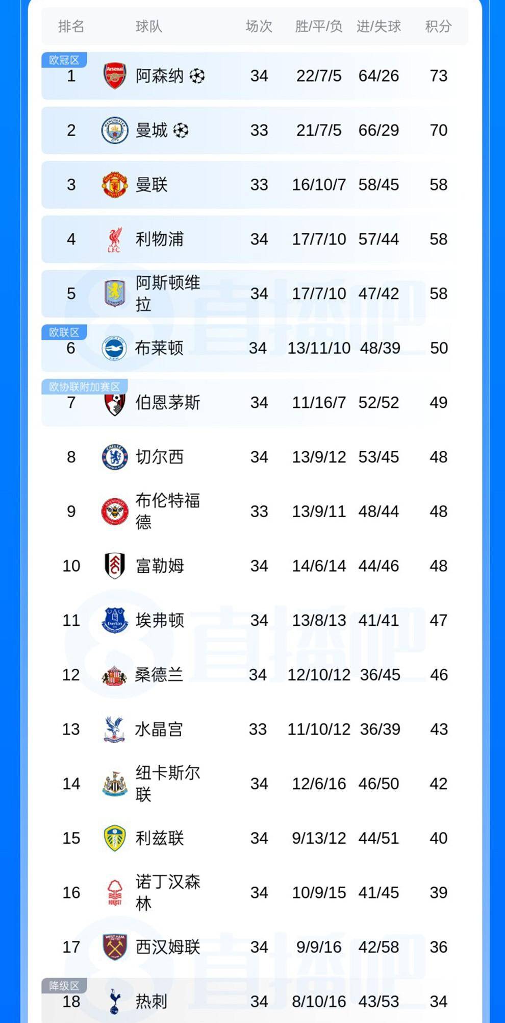 เมื่อดูจากอันดับทั้งหมด อาร์เซนอล รั้งอันดับ 73 ของรายการ แมนฯ ซิตี้ ตามด้วยคะแนน 70 แต้ม แมนเชสเตอร์ ยูไนเต็ด, ลิเวอร์พูล และแอสตัน วิลล่ามี 58 แต้มเท่ากัน และผลต่างประตูได้กลายเป็นปัจจัยสำคัญในการกำหนดอันดับของพวกเขา ไบรตันอยู่ในอันดับที่หกด้วยคะแนน 50 คะแนนและเชลซีอยู่ในอันดับที่แปดด้วย 48 คะแนน ยังคงทำงานอย่างหนักเพื่อคุณสมบัติของเวทียุโรป