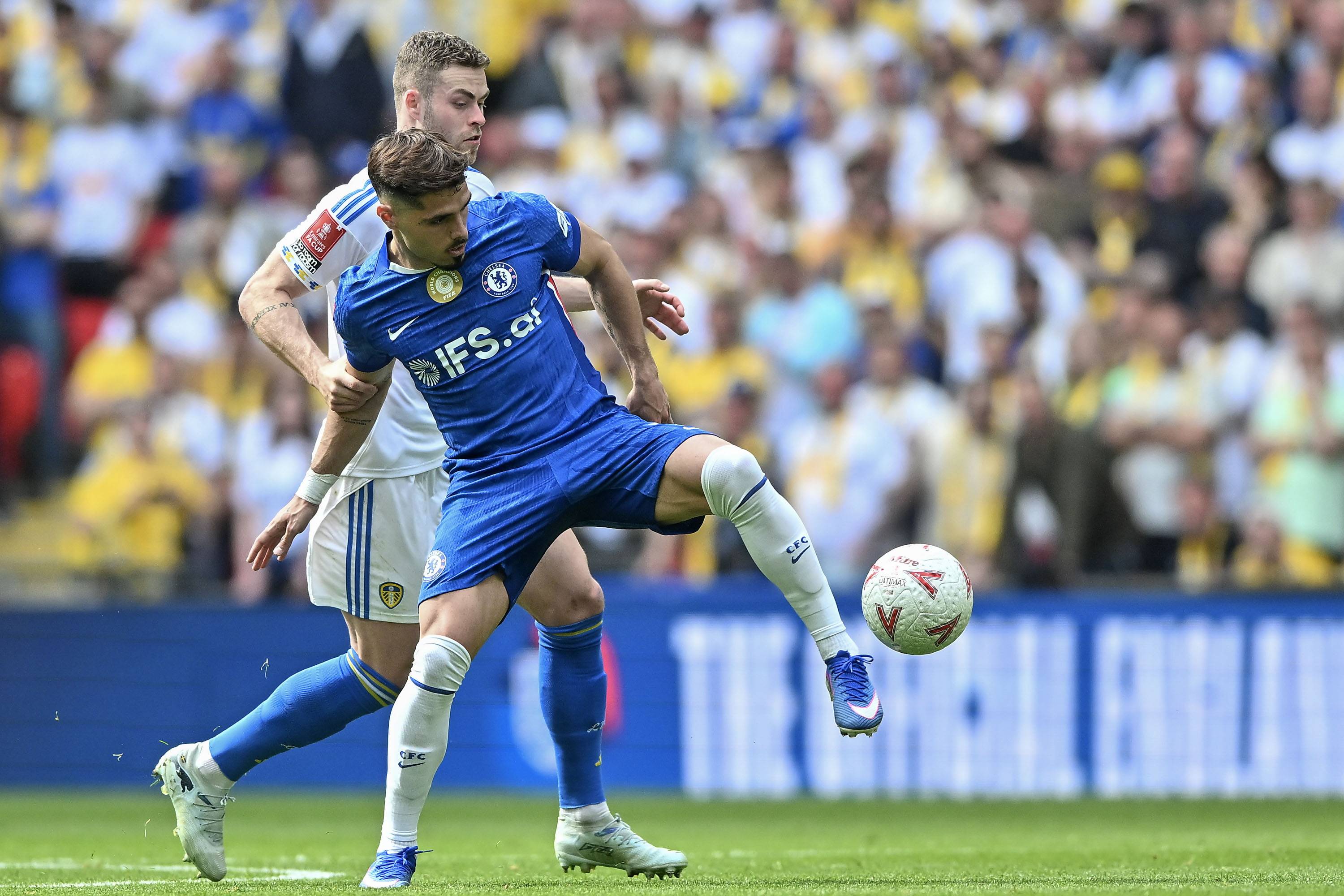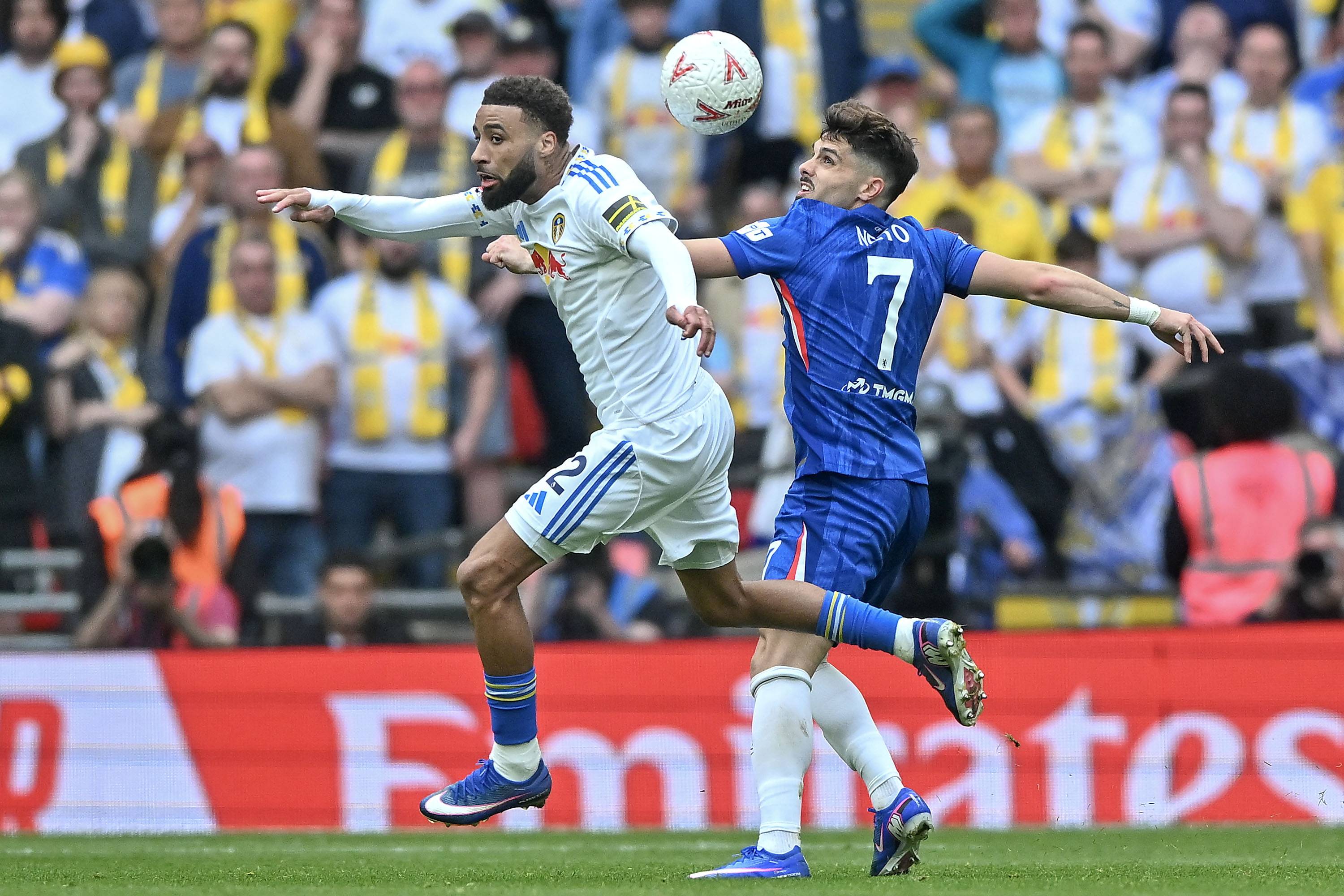 เฟร์นานเดซ นักเตะเชลซี 26 เมษายน (ซ้าย) ต่อสู้กับผู้เล่น Leeds United Ampadou สำนักข่าวซินหัว/OU XIN