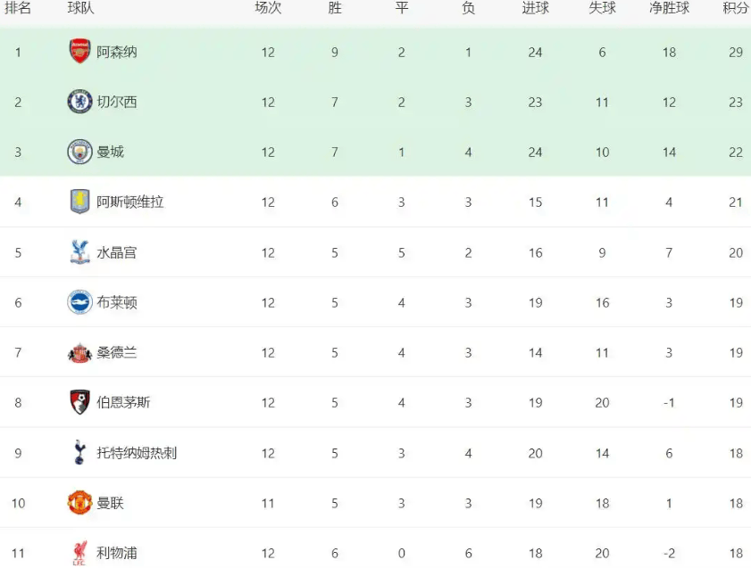 เมื่อเสียงนกหวีดสุดท้ายของรอบที่ 12 ของพรีเมียร์ลีกดังขึ้น ตารางคะแนนลีกก็มีการเปลี่ยนแปลงครั้งใหญ่ อาร์เซนอลถล่มท็อตแน่ม ฮ็อตสเปอร์ 4-1 ที่สนามเอมิเรตส์ สเตเดียม ขยายช่องว่างเป็น 6 คะแนนและยืนยันตำแหน่งจ่าฝูงของพวกเขาเชลซีและแมนเชสเตอร์ ซิตี้ ตามมาในอันดับที่สองและสามตามลำดับ ยังคงกดดันจ่าฝูงอย่างต่อเนื่อง อย่างไรก็ตาม เหตุการณ์ที่น่าตกใจที่สุดคือการตกต่ำอย่างรุนแรงของลิเวอร์พูล แชมป์เก่าที่เพิ่งครองแชมป์เมื่อฤดูกาลที่แล้ว พวกเขาพ่ายแพ้อย่างยับเยิน 0-3 ต่อน็อตติงแฮม ฟอเรสต์ในรอบนี้ ทำให้ร่วงลงมาอยู่ในอันดับที่ 11 เมื่อเทียบกับตำแหน่งของพวกเขาบนจ่าฝูงเมื่อสองเดือนก่อน ความแตกต่างนี้แทบจะไม่สามารถหาคำมาอธิบายได้