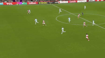 ในนาทีที่ 11 มาร์ติน โอเดการ์ด เป็นผู้ควบคุมการโจมตี. มาดูเอเก้ เตะบอลด้วยส้นเท้า, เบน ไวท์ ส่งลูกครอสจากเส้นหลัง, และเมเรโน่ โหม่งบอลเข้าประตู.