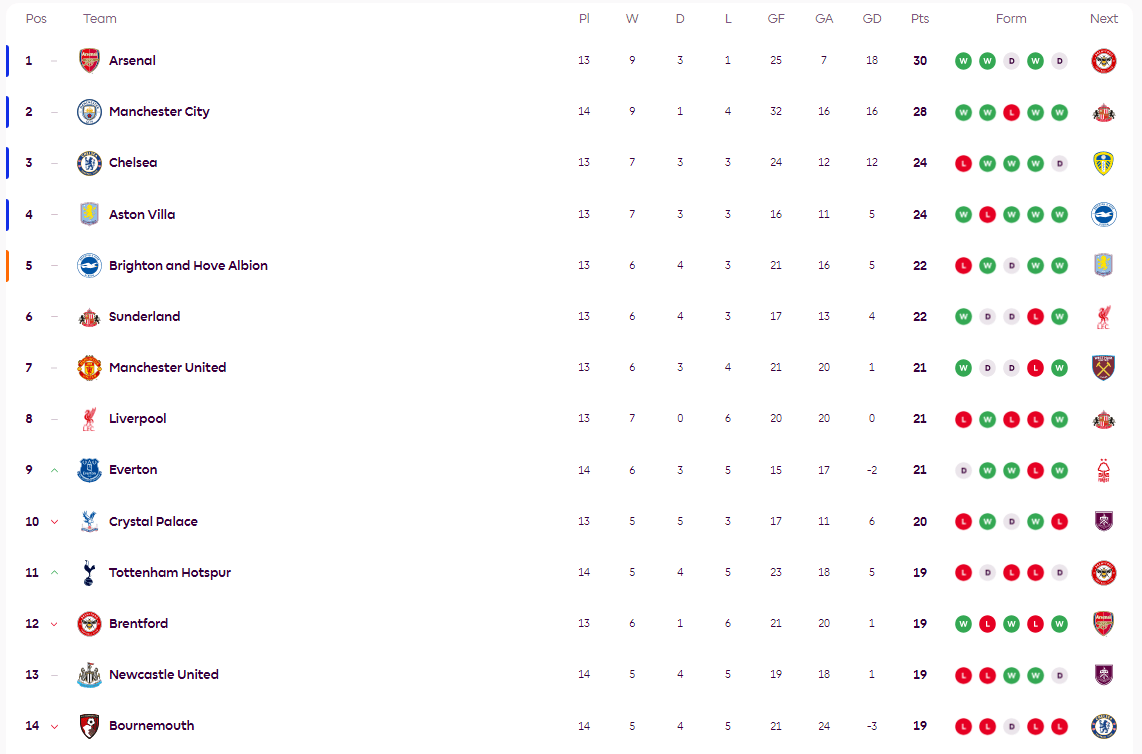 ด้วยจำนวนทีมที่ลงเล่นน้อยลง อันดับแปดอันดับแรกยังคงไม่เปลี่ยนแปลง แมนเชสเตอร์ ซิตี้ ซึ่งได้ลงเล่นครบทุกนัดแล้ว ได้เพิ่มอีกสามคะแนนเข้าสู่ยอดรวมของพวกเขา ทำให้มีคะแนนรวมเป็น 28 คะแนน ขณะนี้พวกเขาตามหลังจ่าฝูงของลีกอย่างอาร์เซนอลเพียงสองคะแนนเท่านั้น