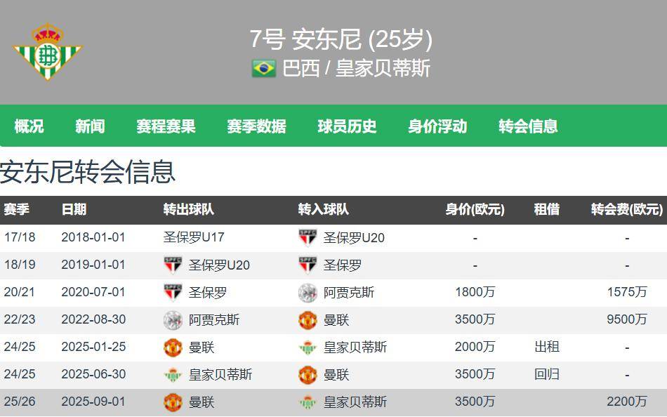 แอนโทนี อายุ 25 ปี สูง 1.72 เมตร เล่นเป็นปีกขวาถนัดเท้าซ้าย สัญญาของเขากับเรอัล เบติส หมดอายุในปี 2030 และตามการประเมินของทรานสเฟอร์มาร์คต์ มีมูลค่าอยู่ที่ 30 ล้านยูโร ทรานสเฟอร์มาร์คต์จะอัปเดตมูลค่าผู้เล่นลาลีกาในวันศุกร์นี้ และคาดว่ามูลค่าของแอนโทนีจะเพิ่มขึ้น