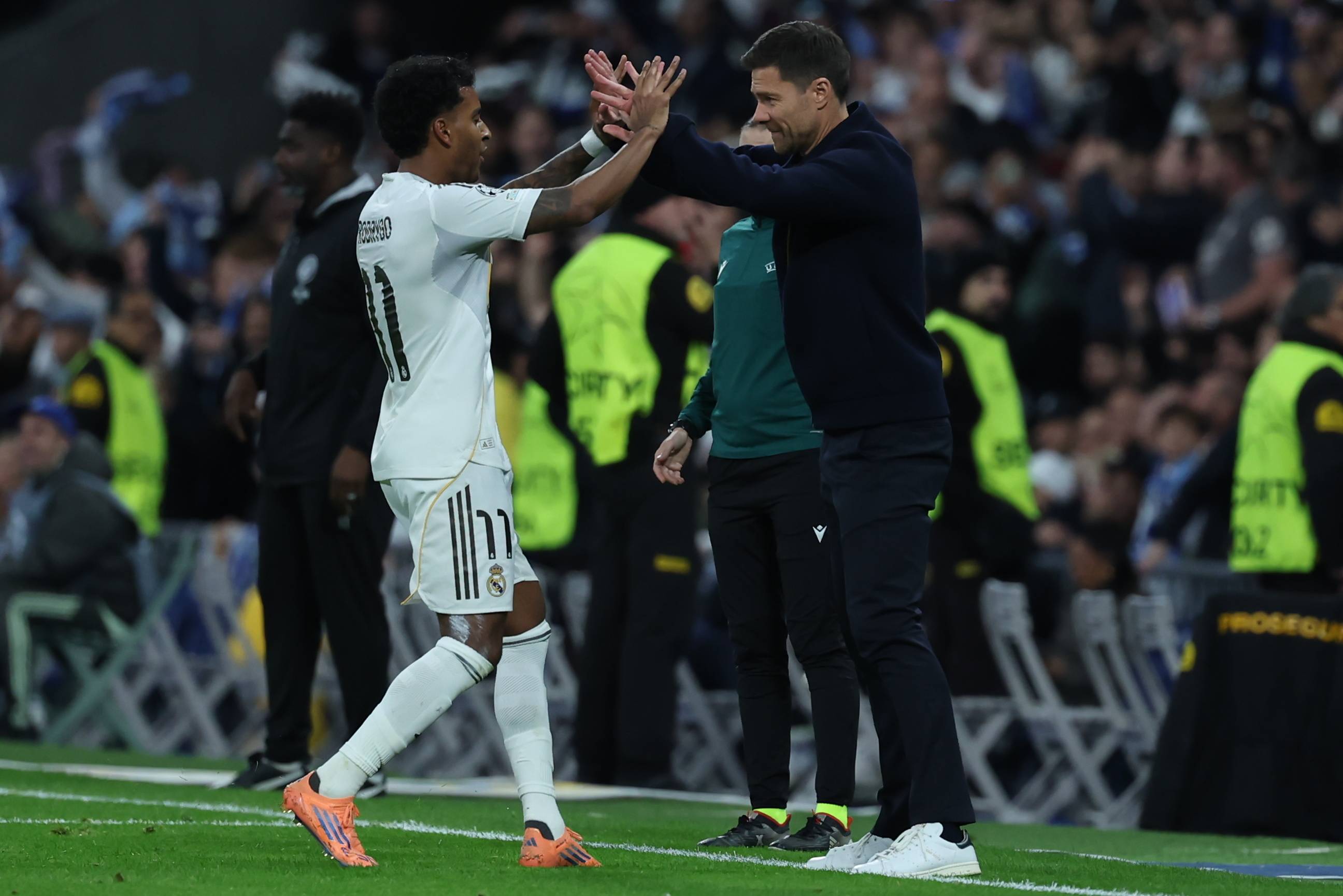 เมื่อวันที่ 10 ธันวาคม โรดรีโก้ (ซ้าย) นักเตะของเรอัล มาดริด ฉลองกับผู้จัดการทีม อัลบาโร่ อาร์เบลัว หลังจากทำประตูได้ สำนักข่าวซินหัว/EPA