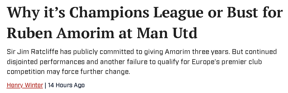 เซอร์จิม แรตคลิฟฟ์ ได้ให้คำมั่นสัญญากับรูเบน อโมริมอย่างเป็นทางการว่าจะให้ดำรงตำแหน่งเป็นเวลา 3 ปี แต่ฟอร์มการเล่นที่ไม่คงที่ของแมนเชสเตอร์ ยูไนเต็ด ยังคงไม่เปลี่ยนแปลง นักข่าวฟุตบอลชาวอังกฤษชื่อดัง เฮนรี วินเทอร์ ได้ให้ความเห็นว่า หากปีศาจแดงไม่สามารถคว้าสิทธิ์เข้าร่วมการแข่งขันยูฟ่า แชมเปียนส์ลีกในฤดูกาลหน้าได้ อาจทำให้สโมสรต้องพิจารณาการแต่งตั้งผู้จัดการทีมใหม่อีกครั้งคำรับรองของเจ้าของทีมแทบไม่มีน้ำหนักเมื่อเทียบกับผลลัพธ์ที่เกิดขึ้น โดยเฉพาะอย่างยิ่งเมื่อคู่แข่งในการแย่งชิงตำแหน่งท็อปโฟร์ต่างสะดุดล้มซ้ำแล้วซ้ำเล่าในฤดูกาลนี้ ปีศาจแดงไม่อาจปล่อยให้โอกาสทองนี้หลุดมือไปได้