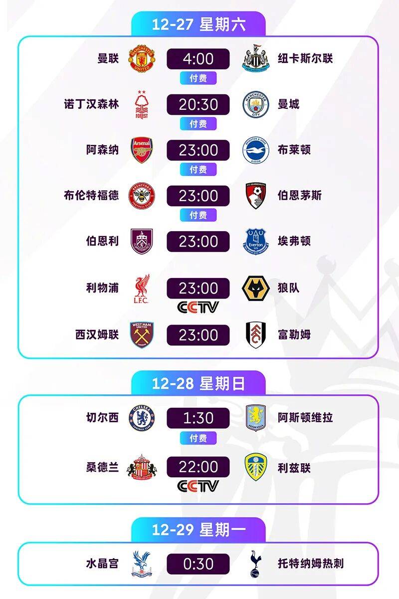 ตามกำหนดการของรายการ CCTV จะถ่ายทอดสดการแข่งขันระหว่างลิเวอร์พูลกับวูล์ฟแฮมป์ตัน วันเดอเรอร์ส ในเวลา 23.00 น. วันเสาร์ และถ่ายทอดสดการแข่งขันระหว่างซันเดอร์แลนด์กับลีดส์ ยูไนเต็ด นัดชี้ชะตาการเลื่อนชั้น ในเวลา 22.00 น. วันอาทิตย์ ทั้งสองรายการถ่ายทอดสดทาง CCTV5