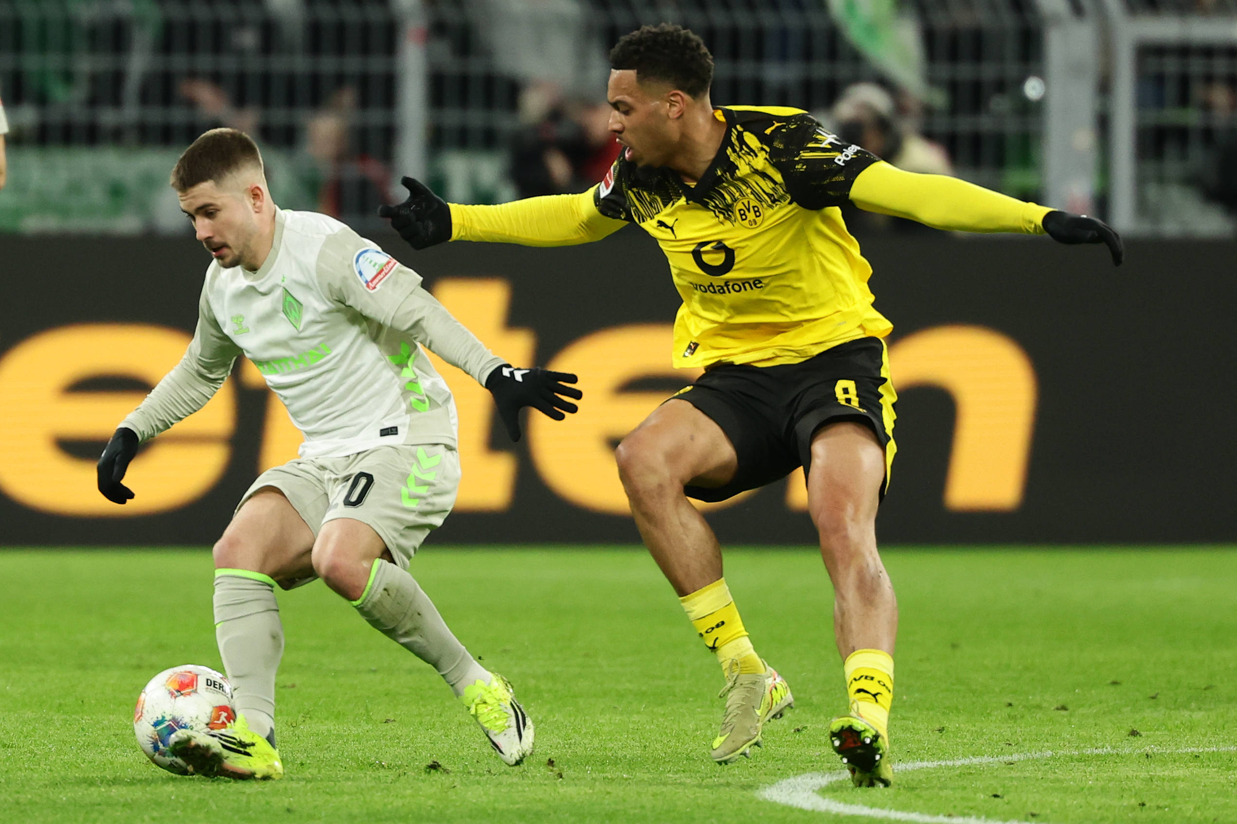 เมื่อวันที่ 13 มกราคม นเมชา ของโบรุสเซีย ดอร์ทมุนด์ (ขวา) ท้าทาย ชมิท ของแวร์เดอร์ เบรเมน ระหว่างการแข่งขัน สำนักข่าวซินหัว (ภาพโดย Joachim Bivalliez)