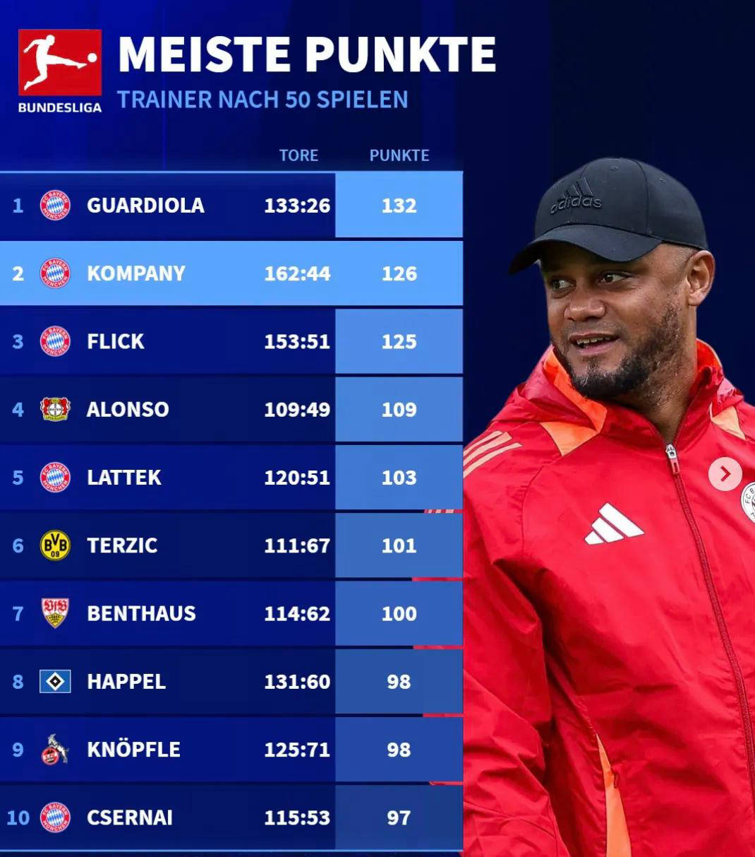 ที่โดดเด่นที่สุดคือ คอมปานีทำคะแนนได้ 126 คะแนนใน 50 นัดแรกของเขาในบุนเดสลีกาในฐานะผู้จัดการทีม ซึ่งอยู่ในอันดับที่สองของบรรดาผู้จัดการทีมทุกคน โดยมีผู้เป็นครูของเขา เป๊ป กวาร์ดิโอลา อยู่ในอันดับแรก สถิตินี้สะท้อนให้เห็นถึงความรู้ที่ลึกซึ้งที่คอมปานีได้รับมาจากกวาร์ดิโอลา และเน้นย้ำถึงความสามารถอันยอดเยี่ยมของกวาร์ดิโอลาในการมองเห็นผู้เล่นที่มีพรสวรรค์ไม่เพียงแต่คอมปานีจะเป็นอดีตกัปตันทีมที่ยอดเยี่ยมเท่านั้น แต่เขายังได้พิสูจน์ตัวเองว่าเป็นผู้มีความสามารถในการเป็นโค้ชที่มีศักยภาพและศักยภาพอันมหาศาลอีกด้วย ในหลายโอกาสในที่สาธารณะ กวาร์ดิโอล่าได้แสดงความชื่นชมและการสนับสนุนอย่างไม่เปลี่ยนแปลงต่อคอมปานี เผยให้เห็นถึงการยอมรับอย่างแท้จริงและลึกซึ้งที่ผู้ฝึกสอนคนนี้มอบให้กับลูกศิษย์ของเขา ปัจจุบัน คอมปานีเป็นกำลังสำคัญในการฟื้นฟูบาเยิร์นมิวนิค และยังสร้างความคาดหวังที่สูงขึ้นสำหรับอนาคตของฟุตบอลเยอรมันและยุโรปอีกด้วย