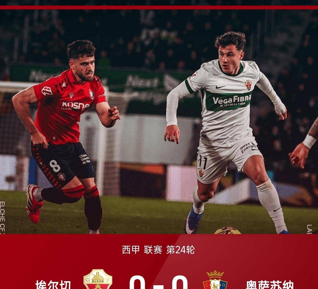 ในการแข่งขันลาลีกาอีกคู่หนึ่ง เอลเช่ เสมอกับ โอซาซูน่า 0-0ตลอดการแข่งขัน ทีมเจ้าบ้านเอลเช่สร้างโอกาสทำประตูได้มากกว่า ความพยายามยิงไกลของเซเปดา การตามซ้ำระยะประชิดของโรดริเกซ และลูกโหม่ง ต่างเฉียดเป้าหมายไปอย่างน่าเสียดาย แต่ไม่มีใครสามารถฝ่าด่านกำแพงมือสิบของผู้รักษาประตูฝ่ายตรงข้ามได้ โอซาซูน่าก็พลาดโอกาสทองเช่นกัน เมื่อการ์เซียได้ยิงโล่งหน้าประตู แต่ลูกยิงของเขาถูกกองหลังสกัดออกจากเส้นประตู ทั้งสองทีมจบเกมด้วยการแบ่งแต้มกันไปทีมละหนึ่งคะแนน