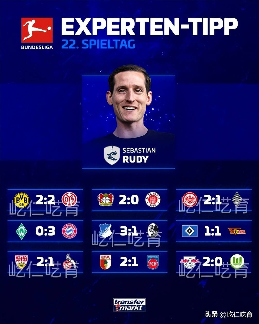 ทรานสเฟอร์มาร์ค บุนเดสลีกา ทำนายผล: โบรุสเซีย ดอร์ทมุนด์ 2-2 ไมนซ์ เวอร์เดอร์ เบรเมน 1-3 บาเยิร์น มิวนิก ฮัมบูร์ก 1-1 ยูเนียน เบอร์ลิน รูดี้ ฮอฟเฟ่นไฮม์ แฟรงค์เฟิร์ต